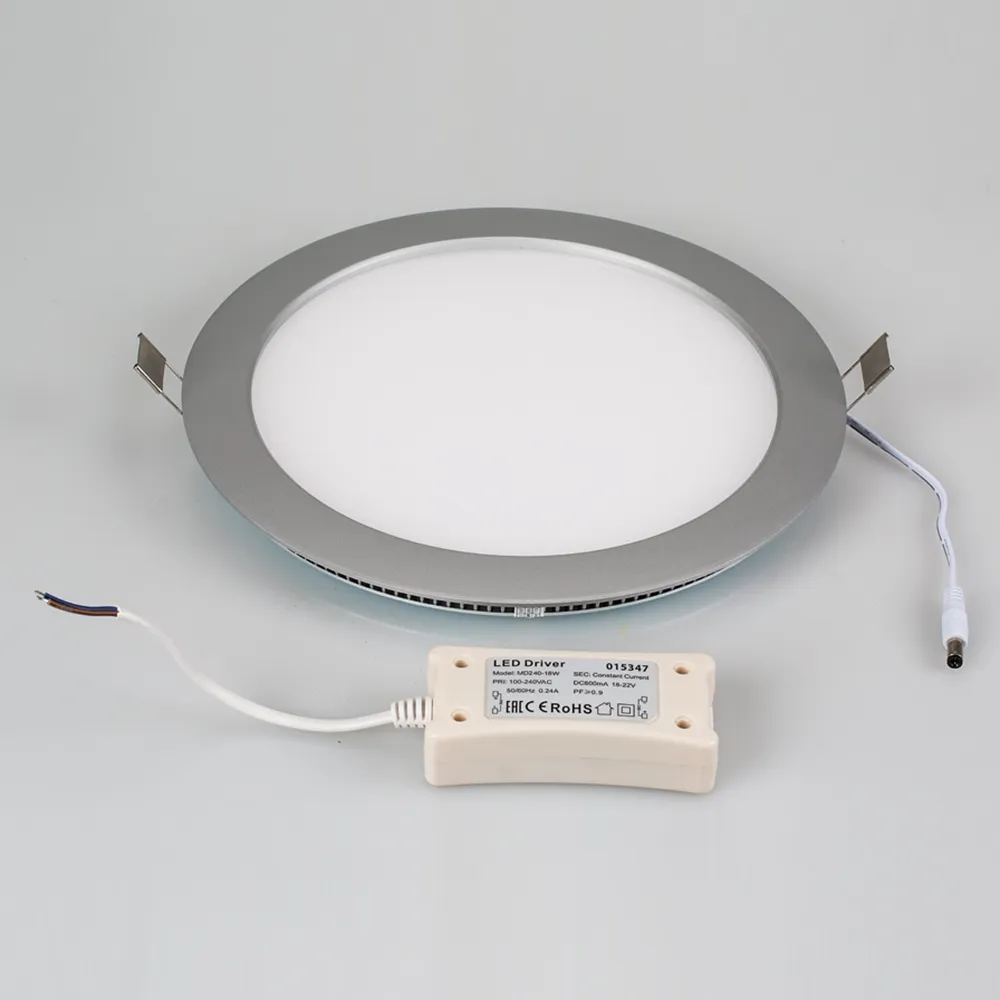 Тонкая круглая панель с эксклюзивным дизайном рамки. Цвет корпуса - серебро. Мощность 18Вт. Цвет свечения ДНЕВНОЙ БЕЛЫЙ 4000K. Световой поток 1260-1500 лм. Угол 120°. Размер Ф240 x 15мм, установка в отверстие 230мм. Питание от сети 220VAC, драйвер в комплекте (DC870mA, 18-22V).