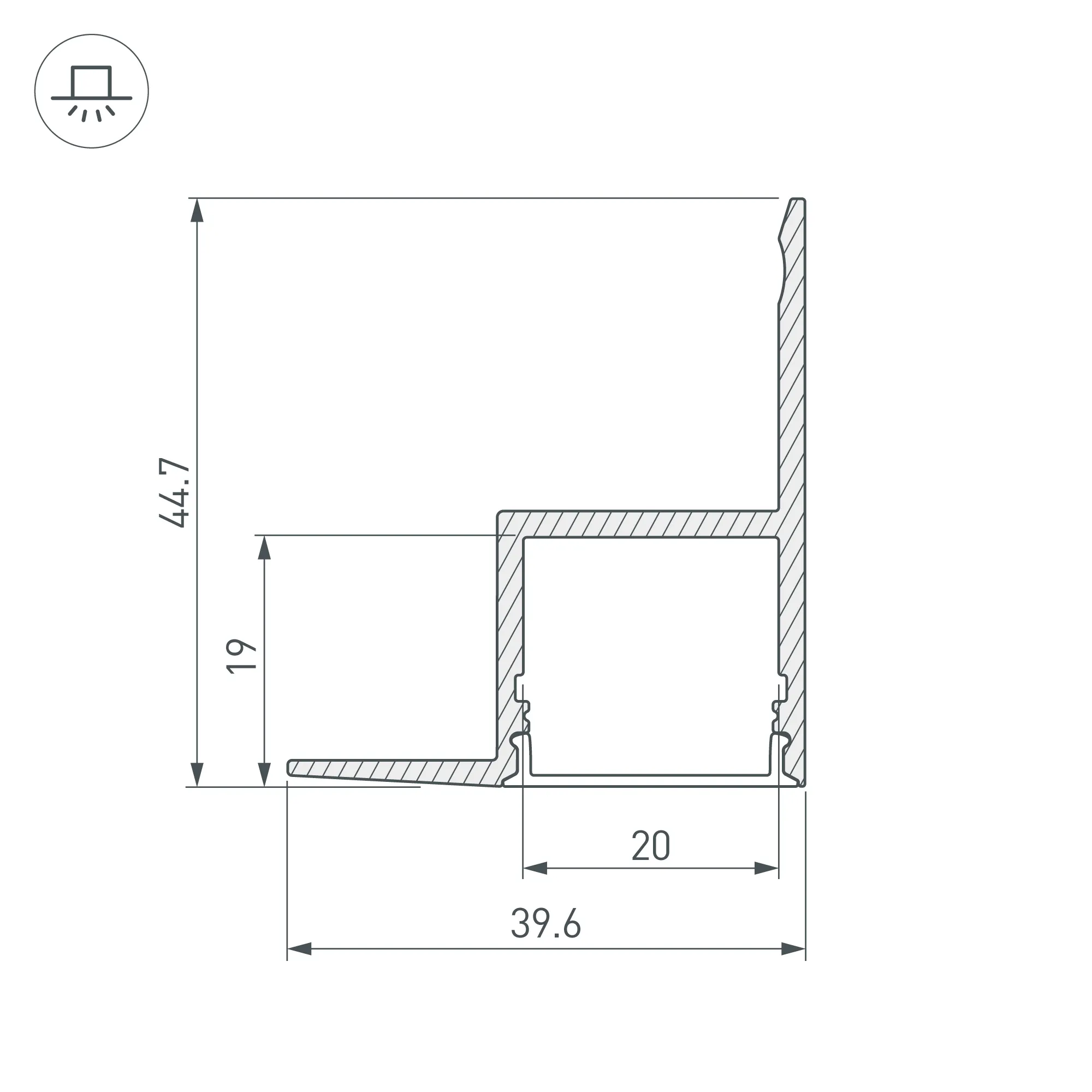 Алюминиевый анодированный встраиваемый профиль для светодиодных лент и линеек. Габаритные размеры (L×W×H): 2000x44,7x39,6 мм. Ширина площадки для ленты 20 мм. Экраны, заглушки и другие аксессуары приобретаются отдельно. Цена за 1 метр.