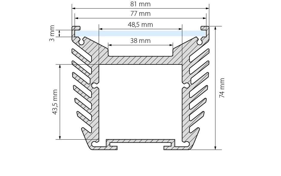 Алюм.анодированный корпус 140Вт/м, 81мм х 71мм х 1000мм. Отсек для БП 48.5мм х 43.5мм. Экран-любое стекло, PC шириной 77мм(толщина не более3мм). Для изготовления прожекторов, под линейки шириной до 37мм. Заглушки, крепление (под DIN-рейку) отдельно.