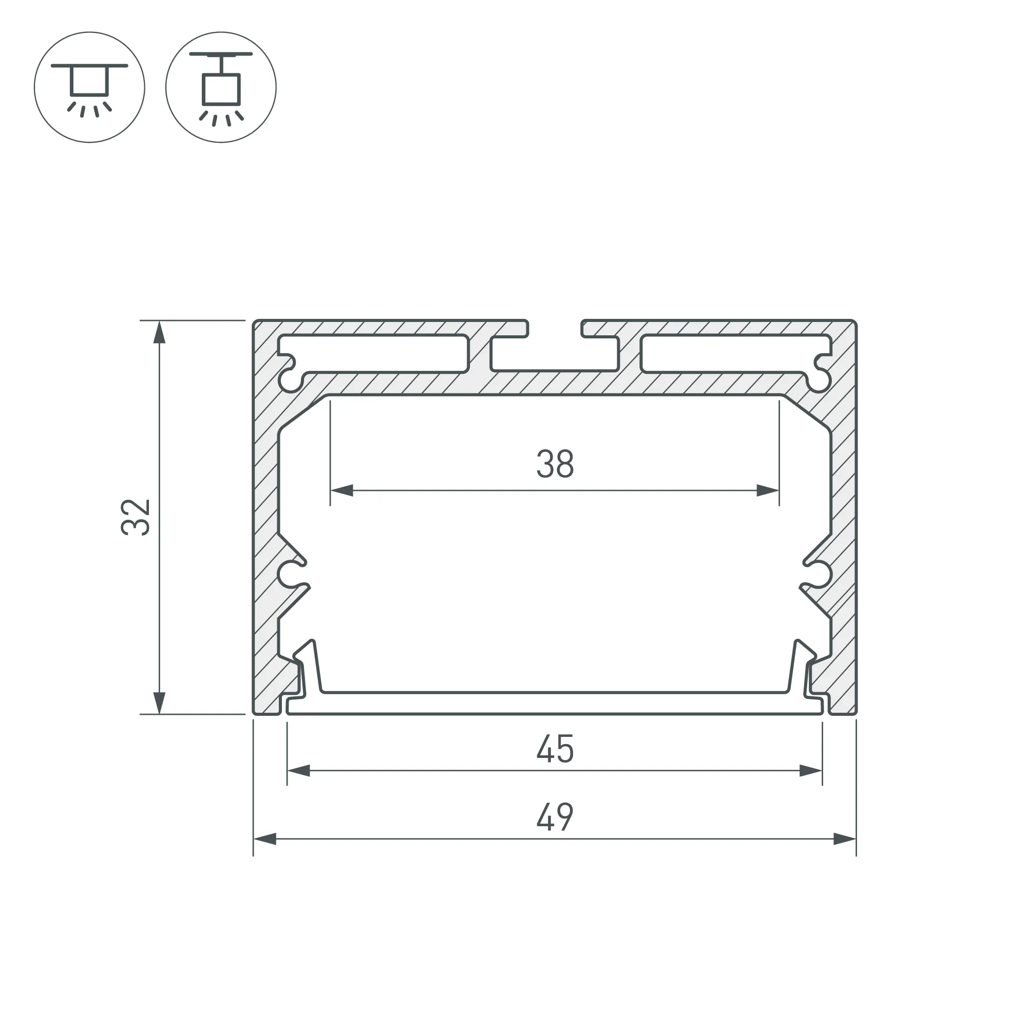 Алюминиевый анодированный профиль для светодиодных лент и линеек. Габаритные размеры (L×W×H): 2000x49x32 мм. Ширина площадки для ленты 38 мм. Экраны, заглушки и другие аксессуары приобретаются отдельно. Цена за 1 метр.