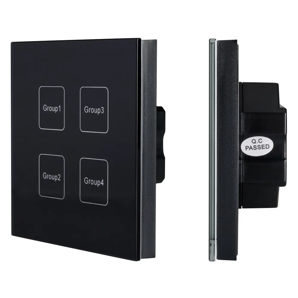 Встраиваемая сенсорная панель с выходом DALI. 4 кнопки, 4 группы. Каждой кнопкой выполняется включение, выключение и диммирование по соответствующей ей группе. Программир-е групп с помощью мастер-контроллера. Установка стартового номера группы выполняется переключателями на корпусе. Питание от шины DALI (4 мА).
