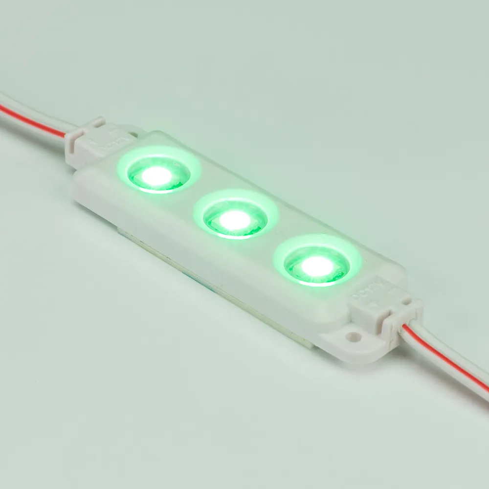 Герметичный светодиодный модуль IP65, ЗЕЛЕНЫЙ 525 нм, напряжение 12 В, мощность 0.72 Вт, 3 светодиода SMD 5060, св.поток 48 лм, угол 120°. 20 шт на проводе, расстояние между центрами модулей 143.2 мм, длина провода между модулями 75 мм, рекомендуемая глубина установки 50–150 мм. Размер 68,2х19.5х5.7 мм. Гарантия 3 года.