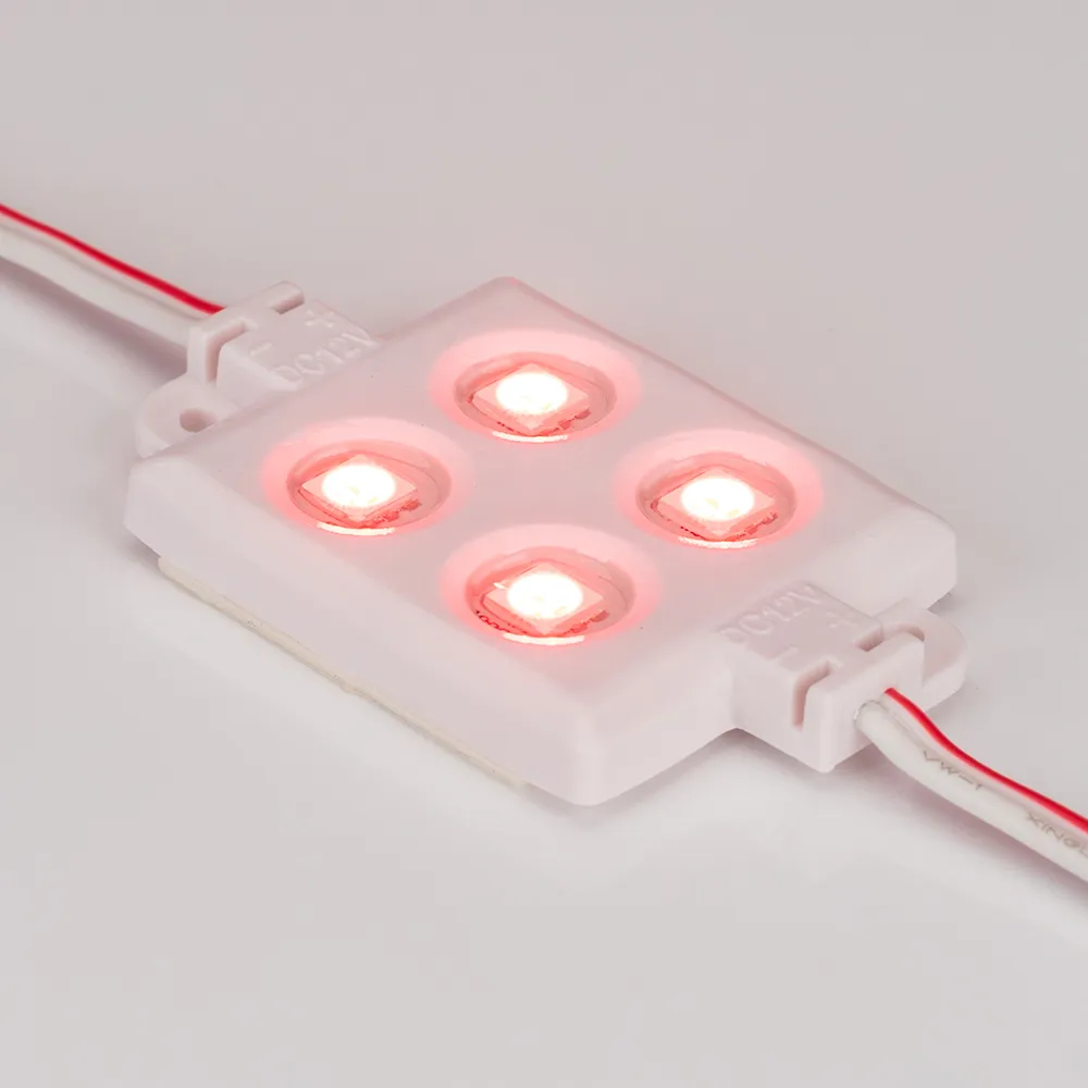 Герметичный светодиодный модуль IP65, КРАСНЫЙ 625 нм, напряжение 12 В, мощность 0.96 Вт, 4 светодиода SMD 5060, св.поток 20 лм, угол 120°. 20 шт на проводе, расстояние между центрами модулей 204 мм, длина провода между модулями 150 мм, рекомендуемая глубина установки 80–180 мм. Размер 54х33.5х5.8 мм. Гарантия 3 года.
