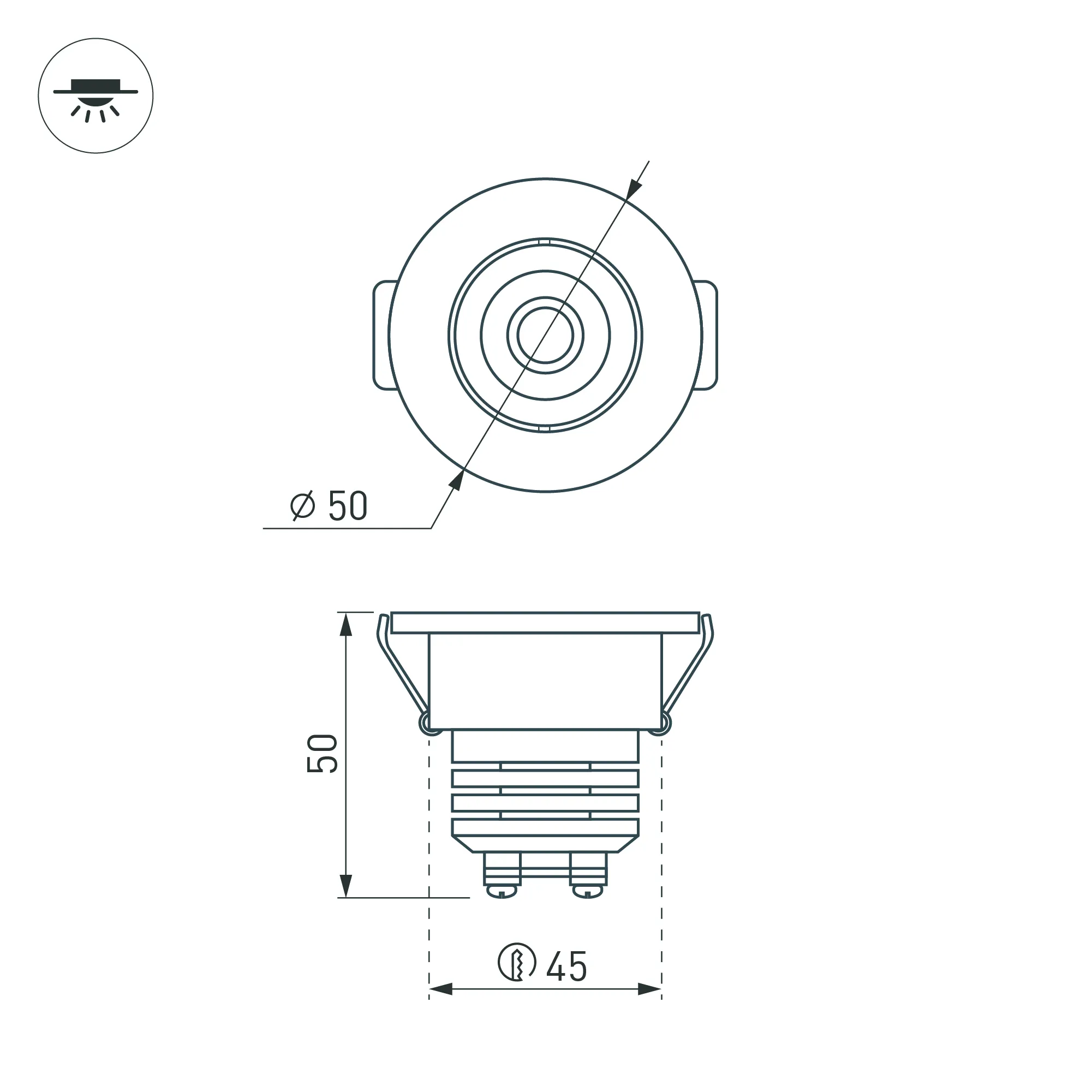 Врезной круглый мебельный светильник 5Вт, корпус белый алюминий. Цвет ТЕПЛЫЙ БЕЛЫЙ 3000K. Светодиод 1х5W Bridgelux. CRI>80, Св.поток 350-400лм, наклоняемая ось, угол 25°. Питание 180-240VAC, 5Вт, 400mA 11-13V, драйвер в комплекте. Размеры d50x50 мм, врезное отверстие d45 мм.