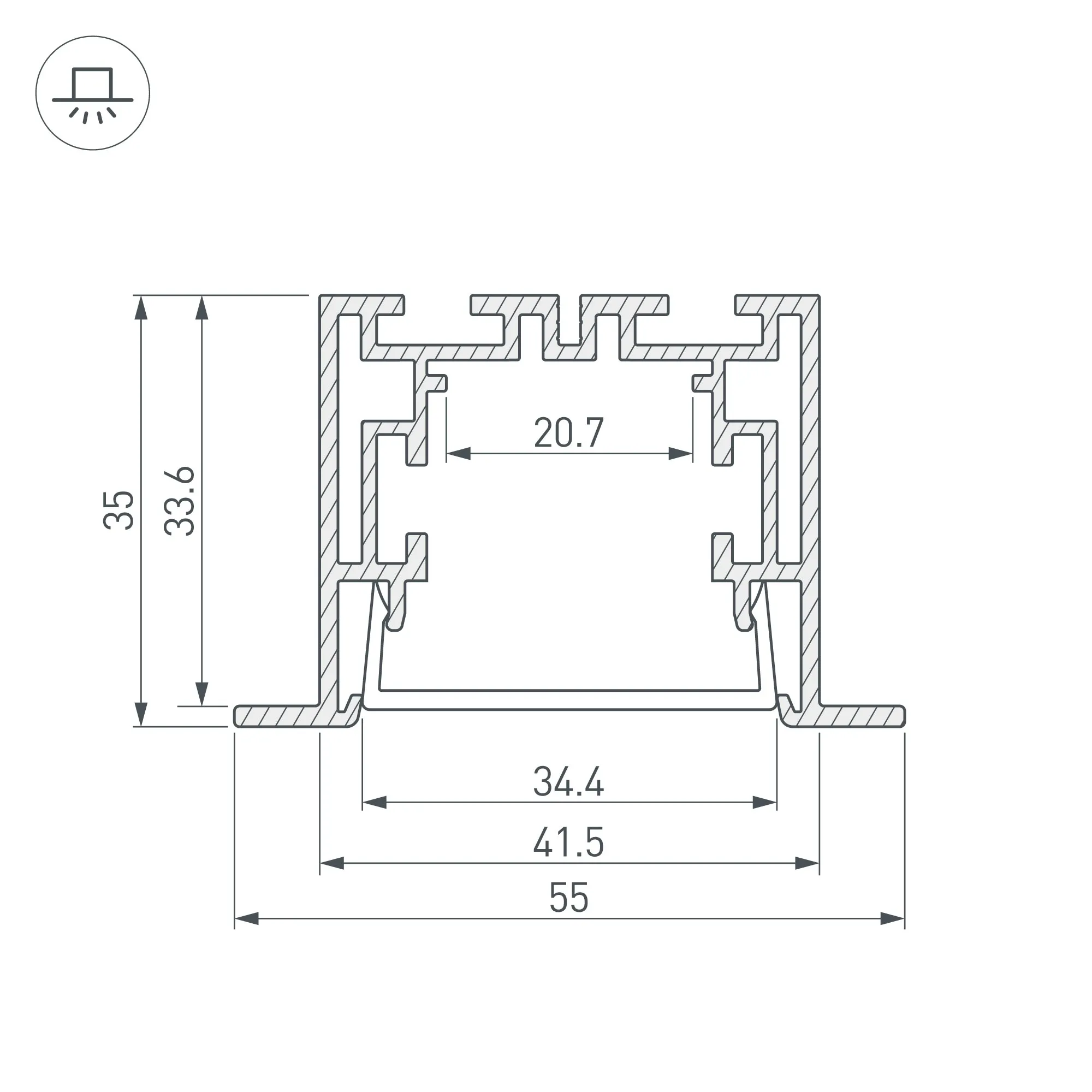 Комплект с экраном. Алюминиевый анодированный профиль для светодиодных лент и линеек. Габаритные размеры (L×W×H): 2500x55x35 мм. Рекомендуемый паз для установки: ширина 45 мм, глубина 70мм (±1 мм). В комплекте профиль, PC матовый экран. Ширина площадки для ленты 20,7 мм. Светопропускание экрана 85%. Аксессуары приобретаются отдельно.