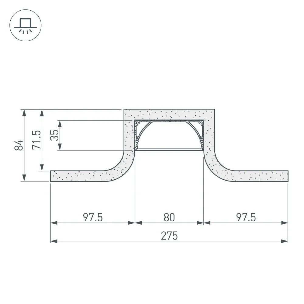 Гипсокартонный модуль серии SLOT со встроенным алюминиевым профилем ALU-POWER-W80N. Внешний вид - прямая линия света в полукруглом слоте (ширина 78 мм). Размеры модуля: длина - 2000 мм, ширина -275 мм, высота - 84 мм. Ширина площадки для ленты - 38,2 мм. Толщина гипсокартона: 12,5 мм. Матовый экран в комплекте. Поставляется не зашпаклеванным. Цена за 1 м.