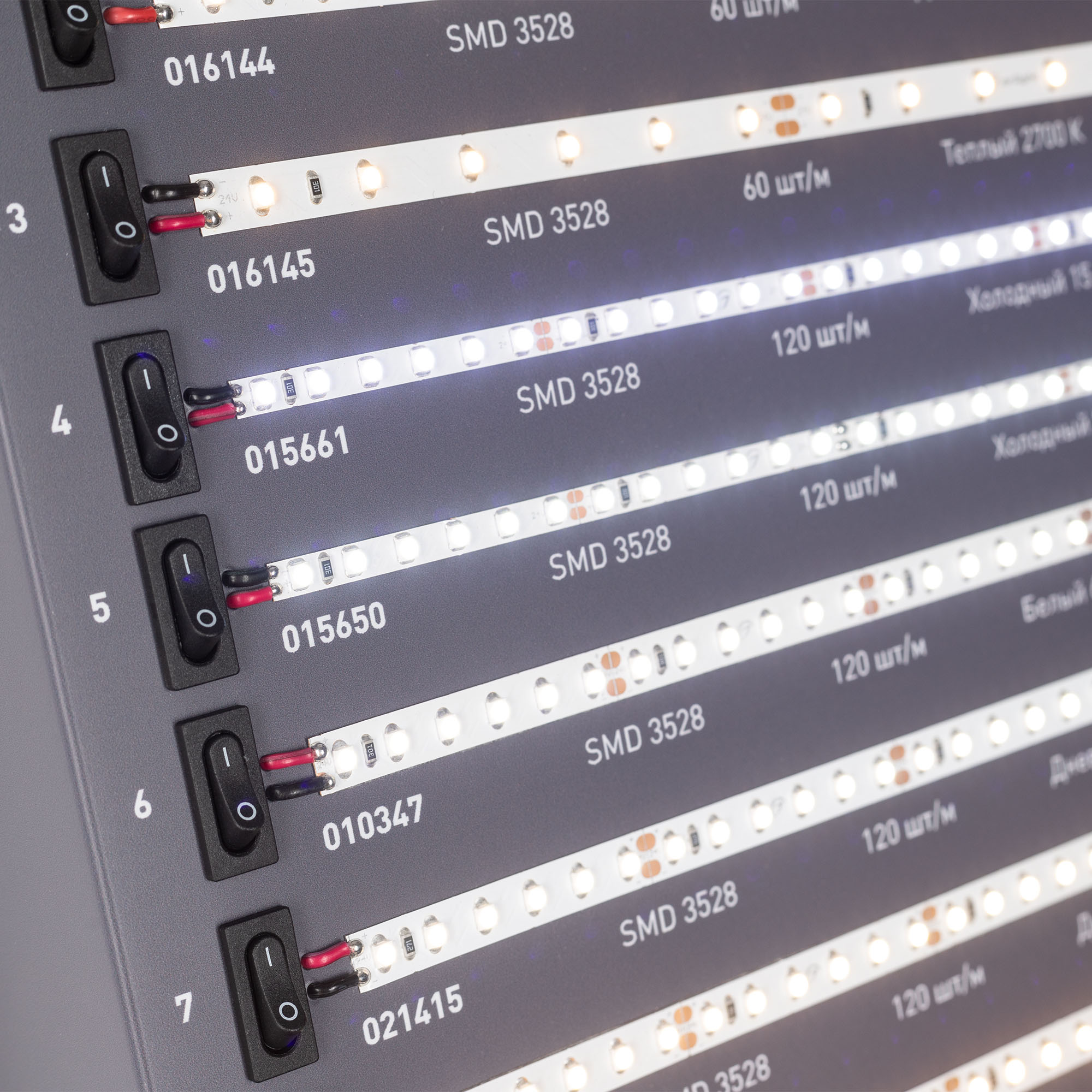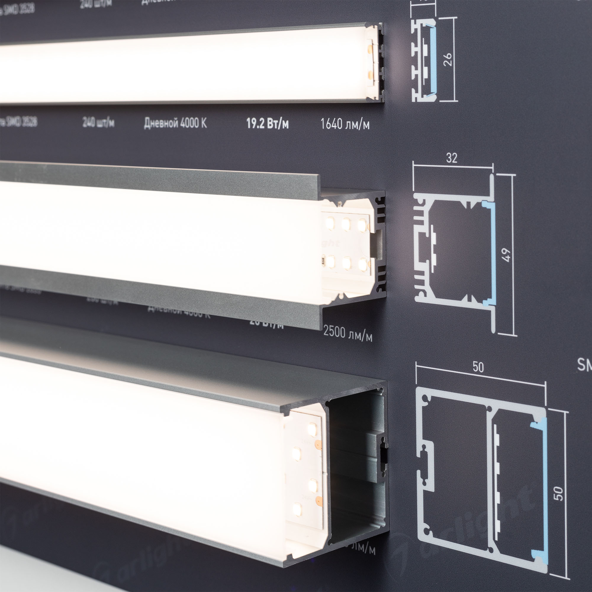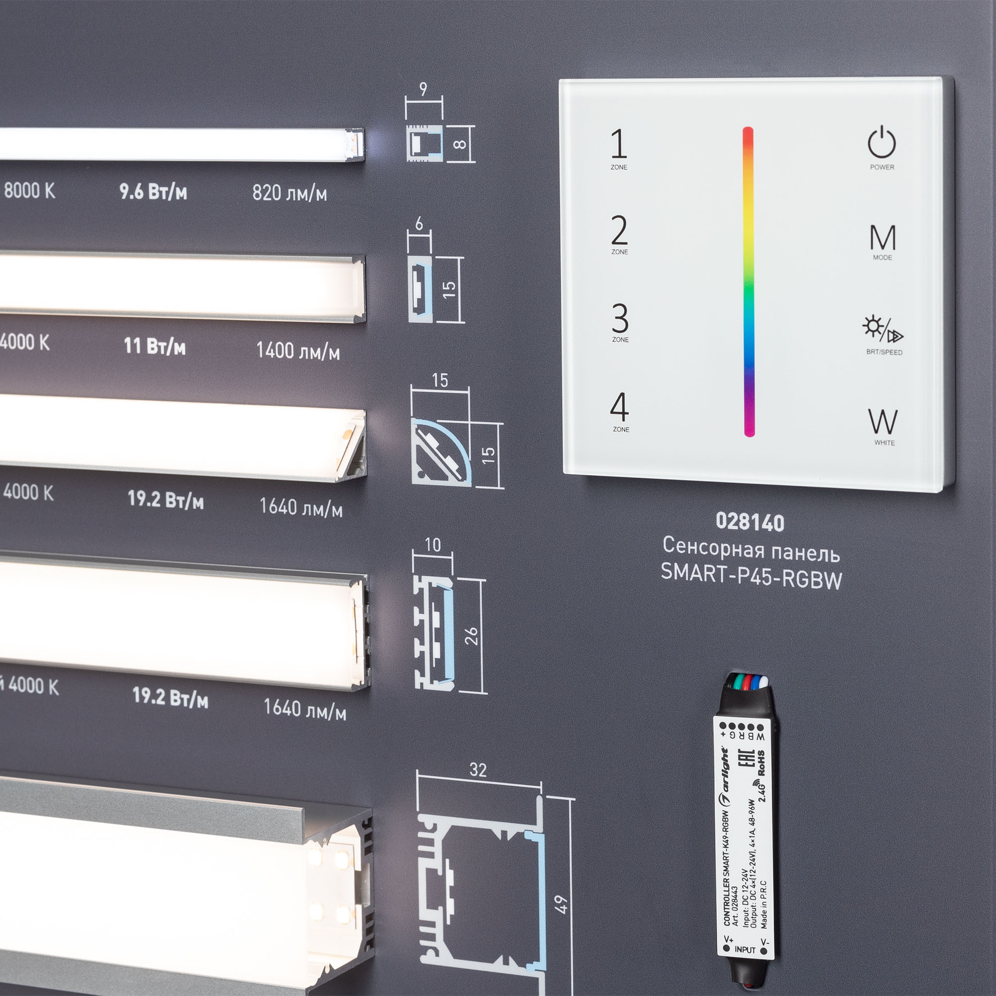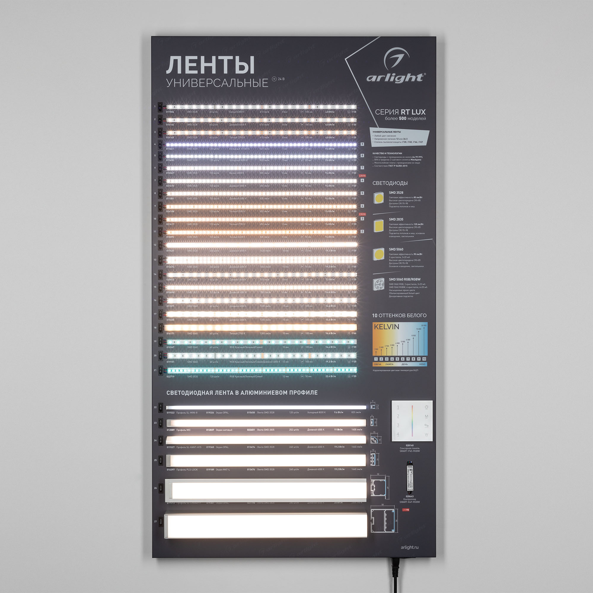 Стенд Светодиодные Ленты Арлайт. Представлена 21 модель лент плюс 3 модели ленты на профели, 6 популярных профилей и управление LUX.