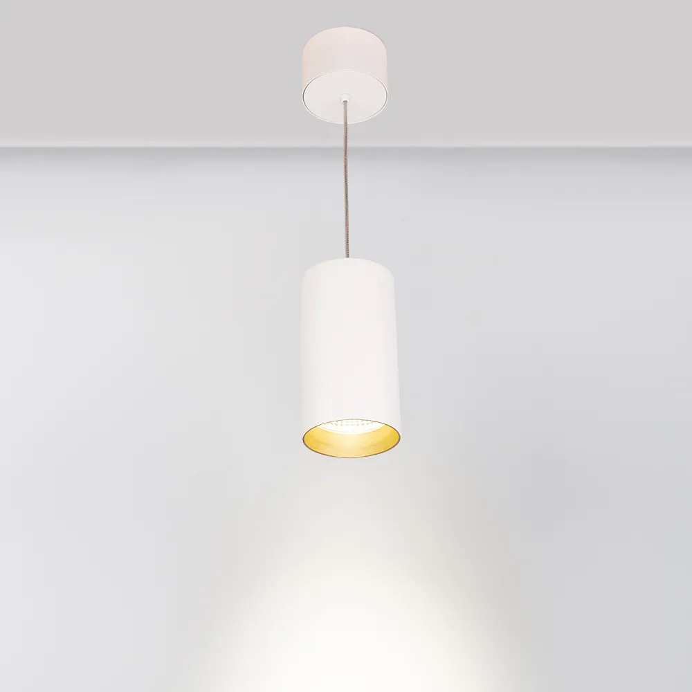 Подвесной светильник 15Вт, белый круглый корпус, золотистая вставка, металл. Цвет ДНЕВНОЙ БЕЛЫЙ 4000K, св.поток 1100лм, CRI(Ra)>80, угол 40°. Размер Ø85x155мм. Встроенный драйвер PRI:220-240VAC, SEC:DC 350mA 30-43V 15Вт.