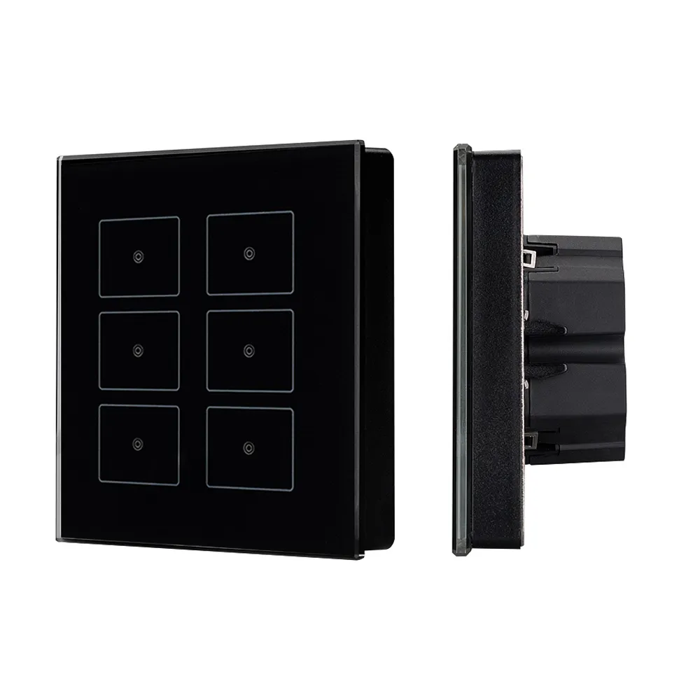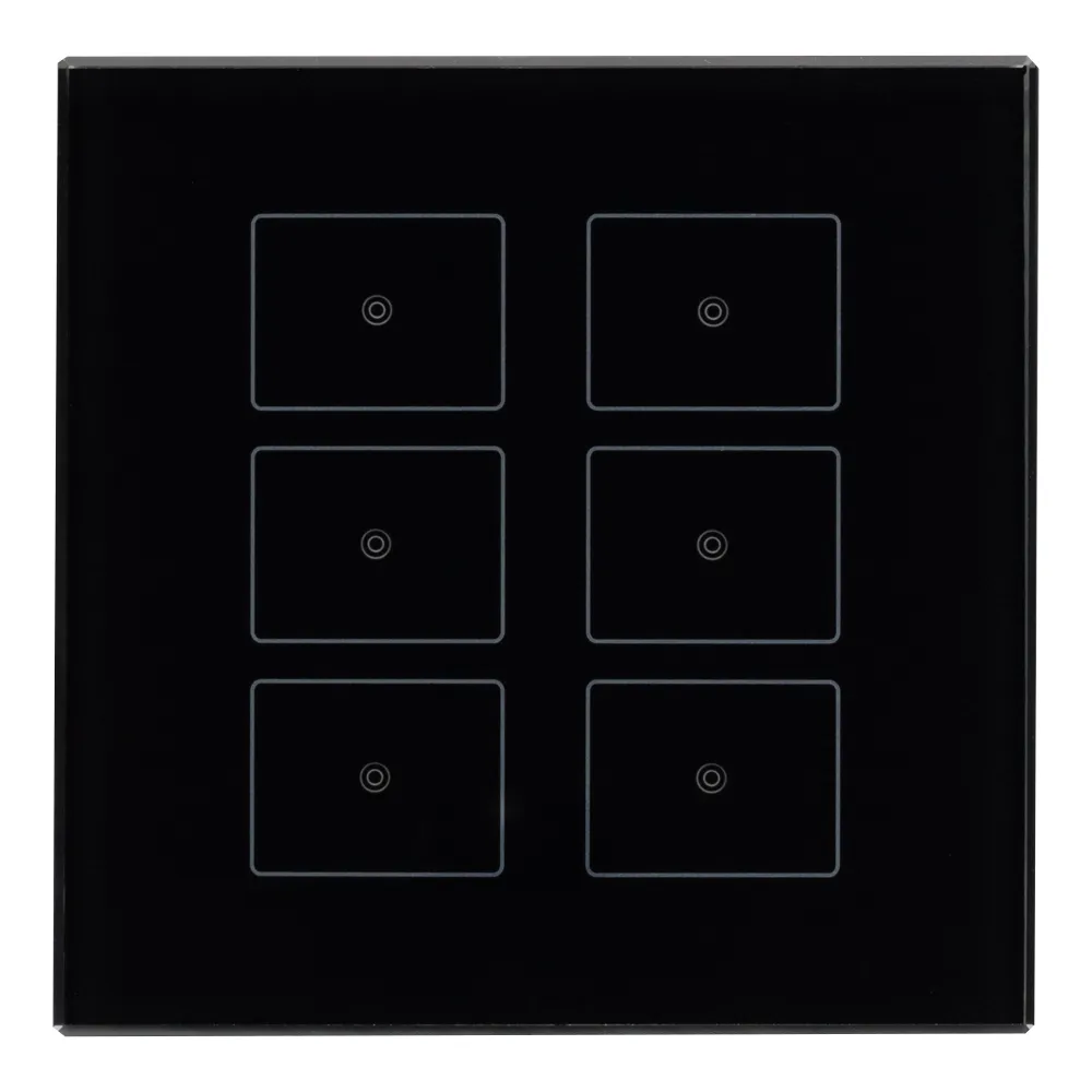 Универсальная стеклянная встраиваемая настенная панель стандарта KNX с шестью сенсорными кнопками. Цвет корпуса черный. Питание от шины KNX DC 21-30V. Размер 86х86х32 мм.