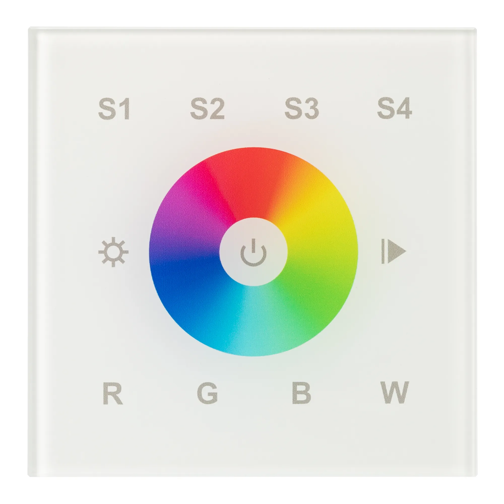 Настенная встраиваемая стеклянная панель белого цвета с сенсорным управлением (сенсорное кольцо и 11 сенсорных кнопок) для мультицветных светодиодных RGBW-лент. 1 зона управления, 4 слота памяти пользовательских настроек. Питание от 230V или от шины DALI. Система команд DT8: до 64 устройств (DALI-DT8), при адресации DT8 4 каналов (RGBW) на 1 адрес.