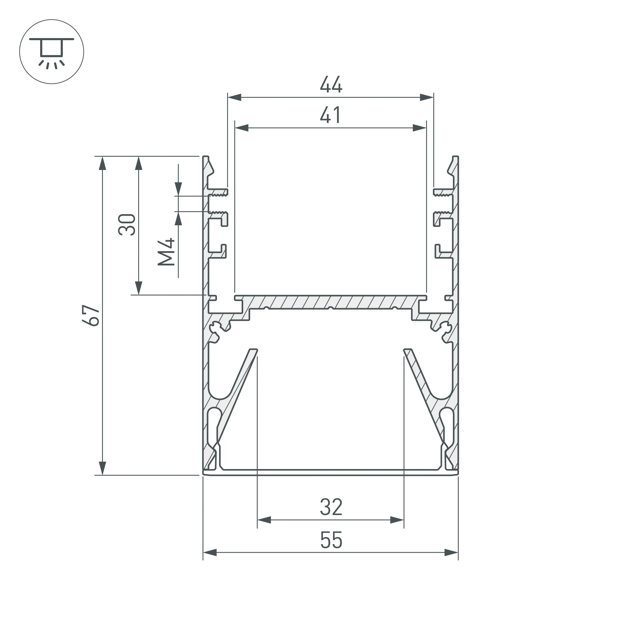 Комплект с экраном. Алюминиевый анодированный профиль для светодиодных лент и линеек, с отсеком для блока питания. Размер отсека 29х44мм. Габаритные размеры (L×W×H): 2000x55x67,4 мм. Ширина площадки для ленты 32,3 мм. Аксессуары приобретаются отдельно.