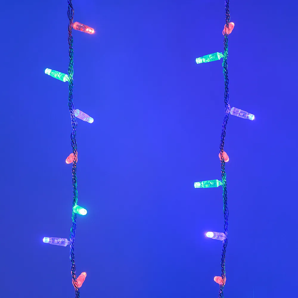 Светодиодный Занавес Classic. Размер 2000x3000 мм (длина 2000 мм, высота 3000 мм). 12 ниспадающих нитей длиной 3000 мм. 756 светодиода размером 7 мм. Цвет свечения RGBY, (цвет светодиодов чередуется), постоянное свечение и 8 динамических эффектов с резким световым рисунком (прозрачная вогнутая линза). Провод прозрачный, ПВХ. Питание 230 В, Мощность 108 Вт, защита IP65, применение в помещении и на улице под навесом. Аксессуар для подключения и выбора режима свечения в комплекте.