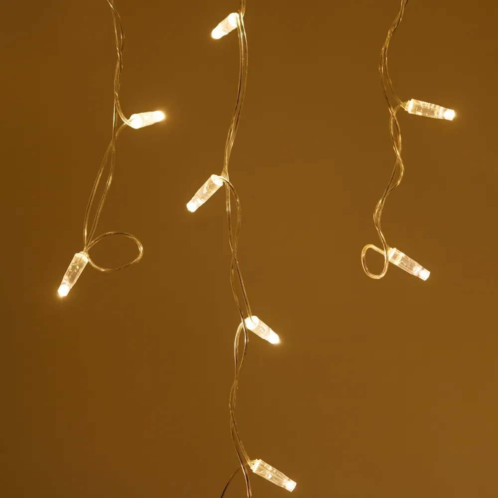 Светодиодная бахрома Classic. Размер 2400x600 мм (длина 2400 мм, по длине 24 нити высотой 200/600 мм). Количество светодиодов 88 шт размером 7 мм. Цвет свечения ТЕПЛЫЙ БЕЛЫЙ (3000 К), эффект постоянного свечения с резким световым рисунком (прозрачная вогнутая линза). Провод прозрачный, ПВХ. Питание 230 В, Мощность 6 Вт, защита IP65, применение на улице под навесом. Аксессуары для подключения приобретаются отдельно.