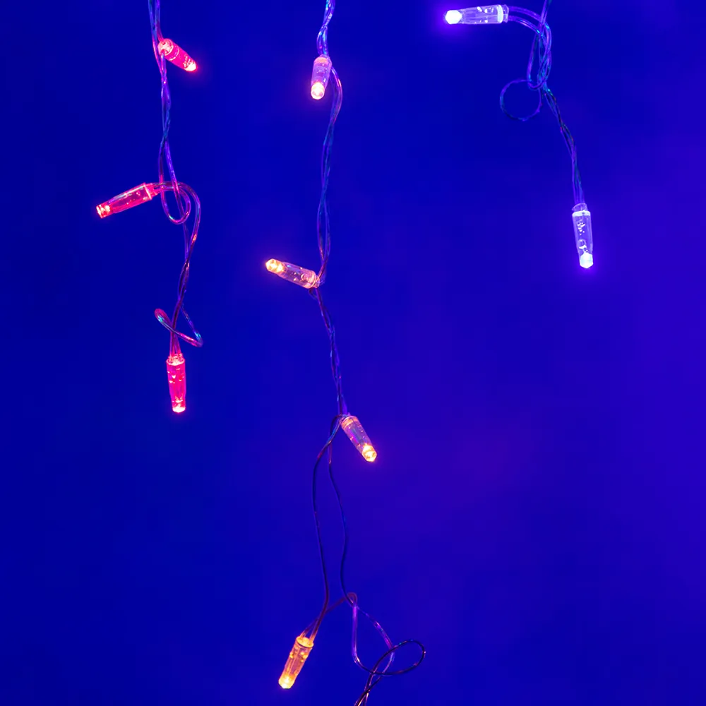 Светодиодная бахрома Classic. Размер 2400 мм (длина 2400 мм, по длине 24 нити высотой 200 / 600 мм). Цвет свечения RGB (цвет светодиодов чередуется), динамические и статические эффекты свечения свечения с резким световым рисунком (прозрачная вогнутая линза). Провод прозрачный, ПВХ. Питание 230 В, Мощность 6 Вт, защита IP65, применение на улице под навесом. Аксессуары для подключения приобретаются отдельно.
