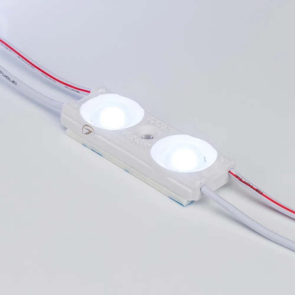 Светодиодный модуль, 2 светодиода smd 2835, Герметичный корпус IP 67, Пластик ABS, Цвет Холодный белый 8000-10000К, Световой поток 90 лм, Угол 160°, На проводе 40 шт, Длина провода 95мм, расстояние между центрами модулей 140мм, Рекомендуемая глубина установки 60-150мм, Питание 12В, мощность 0.96 Вт, Габариты ДxШxВ: 45.5х16х5.7 мм, IP 67 Технология Constant Current