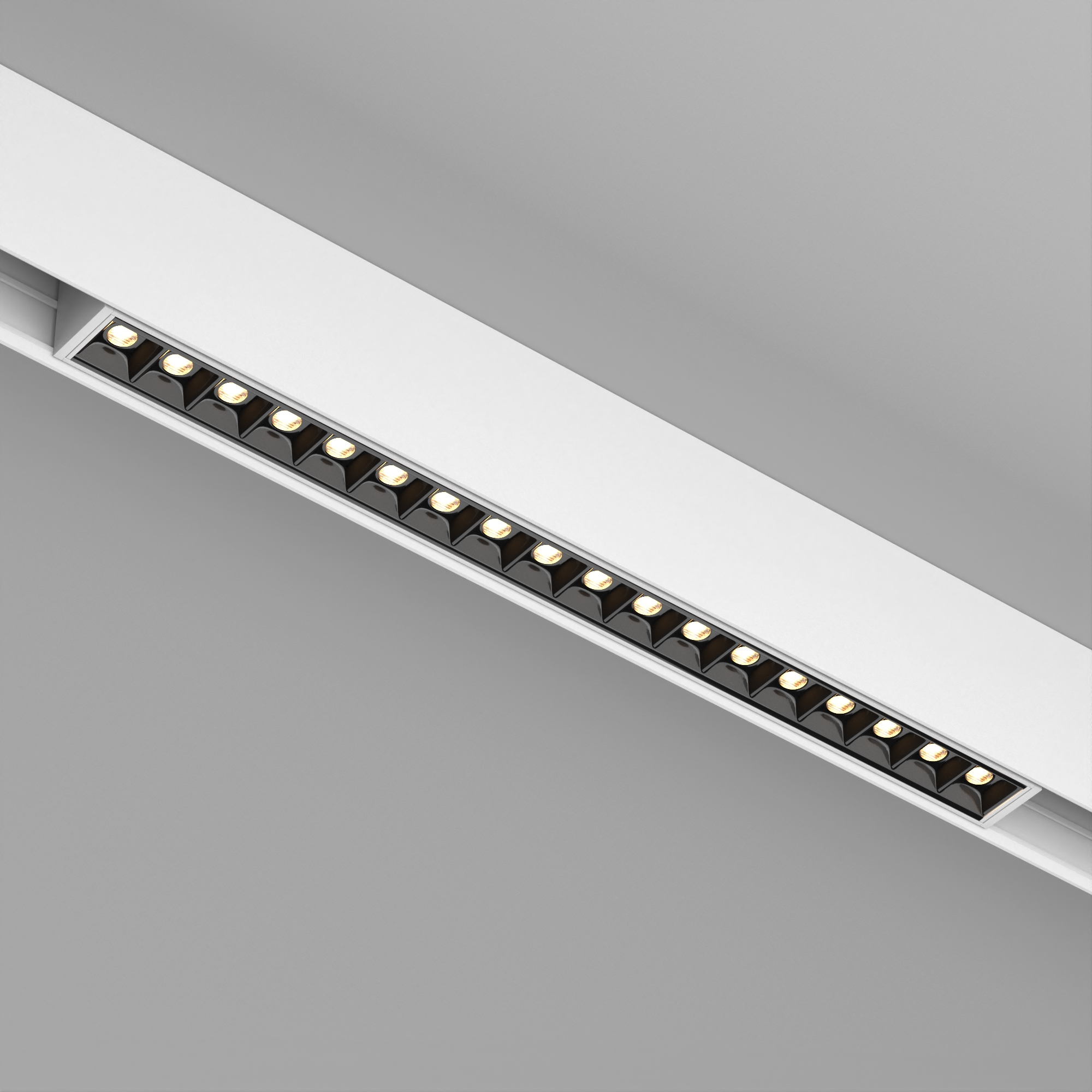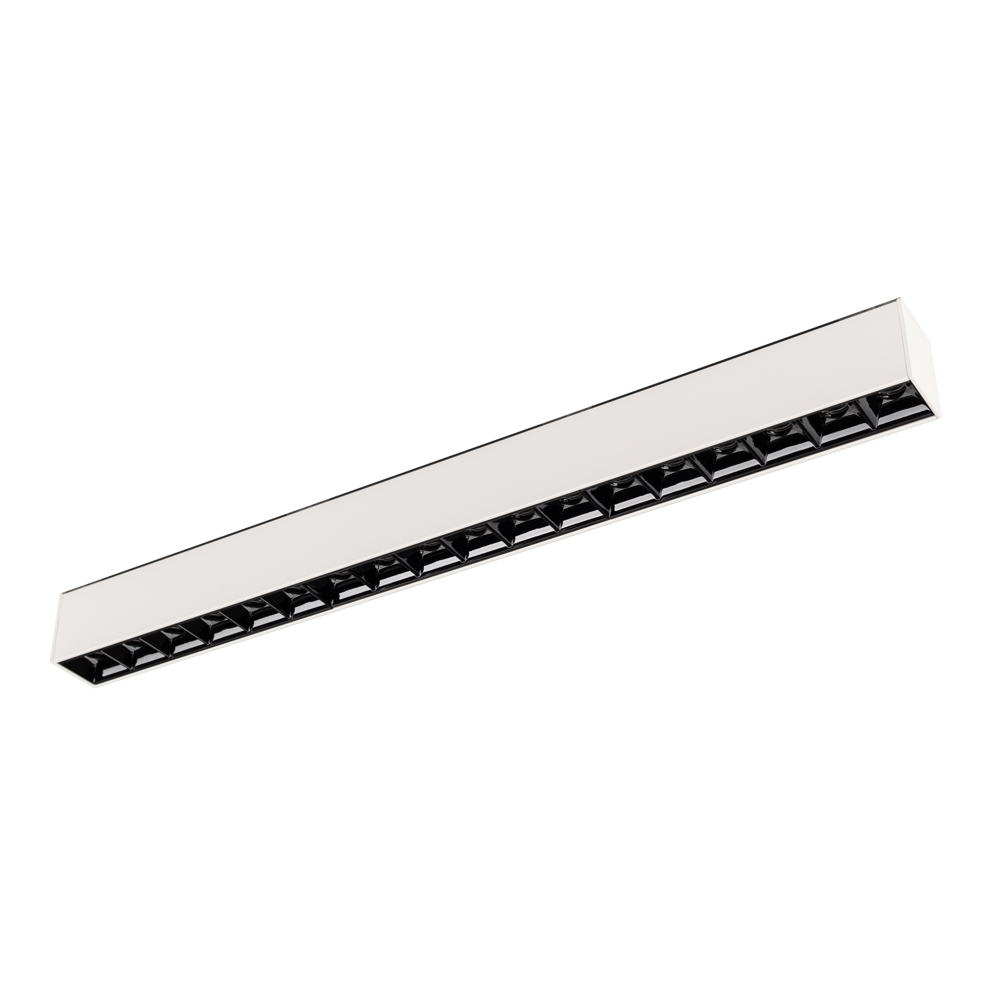 Светильник для магнитных треков шириной 45мм, 18Вт. Цвет свечения ТЕПЛЫЙ 3000K, световой поток 1200лм, угол 15°, CRI>90. Корпус прямоугольный, металл, цвет белый, IP20. Размеры LxWxH 481x35x43мм. Входное напряжение DC24V, мощность 18Вт. Драйвер DС24V/AC230V поставляется отдельно. Диммируется только с 026407(1), 027633.