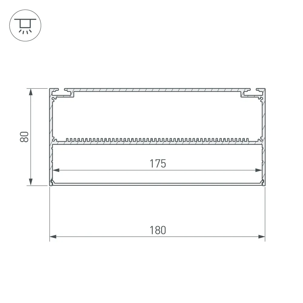 Комплект с экраном. Алюминиевый анодированный подвесной профиль для светодиодных лент и линеек, с отсеком для блока питания (высота отсека 40 мм). Габаритные размеры (L×W×H): 2000x180x80 мм. Ширина площадки для ленты 175 мм. Аксессуары приобретаются отдельно.