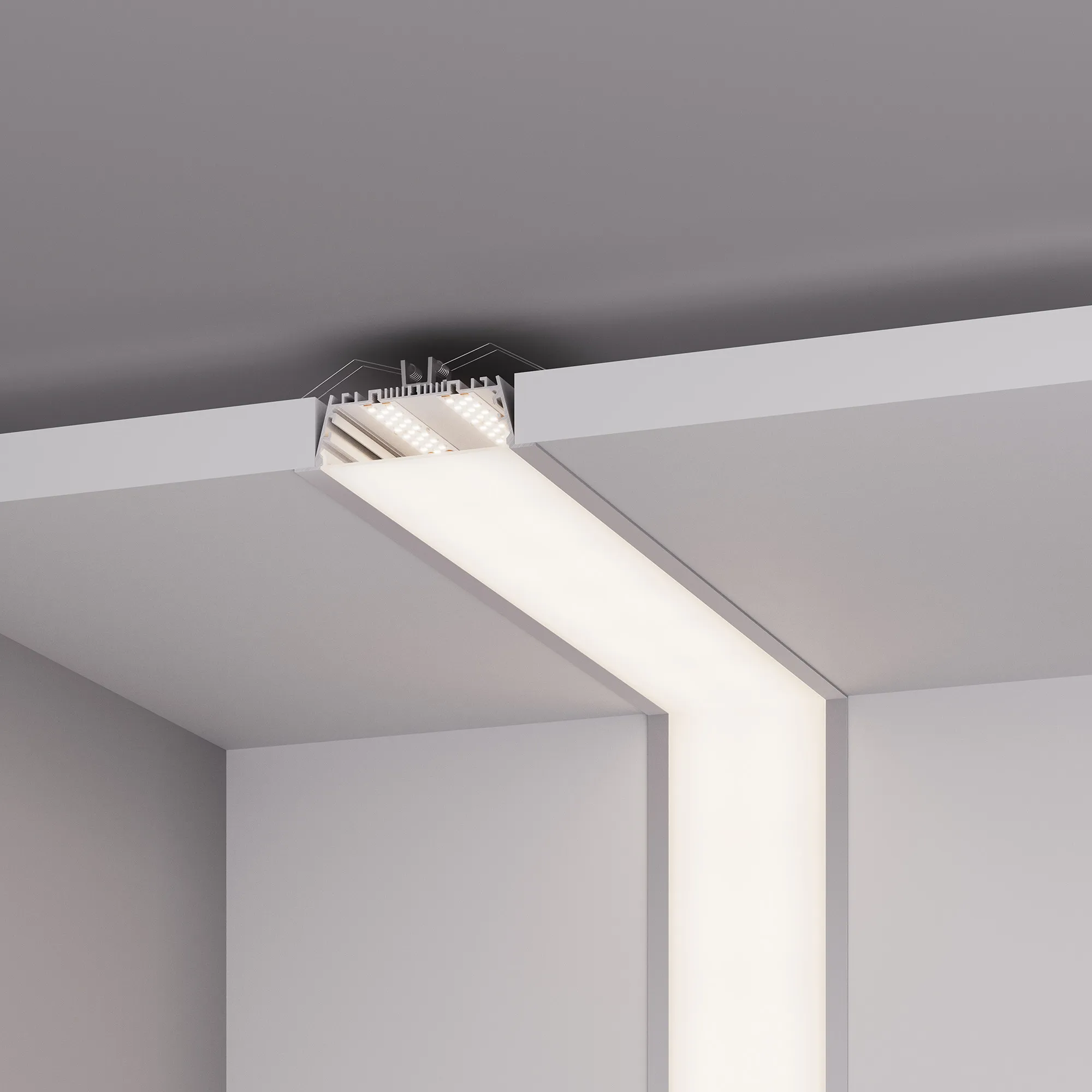 Комплект с экраном. Алюминиевый анодированный встраиваемый профиль для светодиодных лент и линеек. Габаритные размеры (L×W×H): 2000x123x35 мм. Ширина световой линии 96 мм. Паз для установки 103х33 мм. Светопропускание экрана 67%. Ширина площадки для ленты 77 мм. Аксессуары приобретаются отдельно.