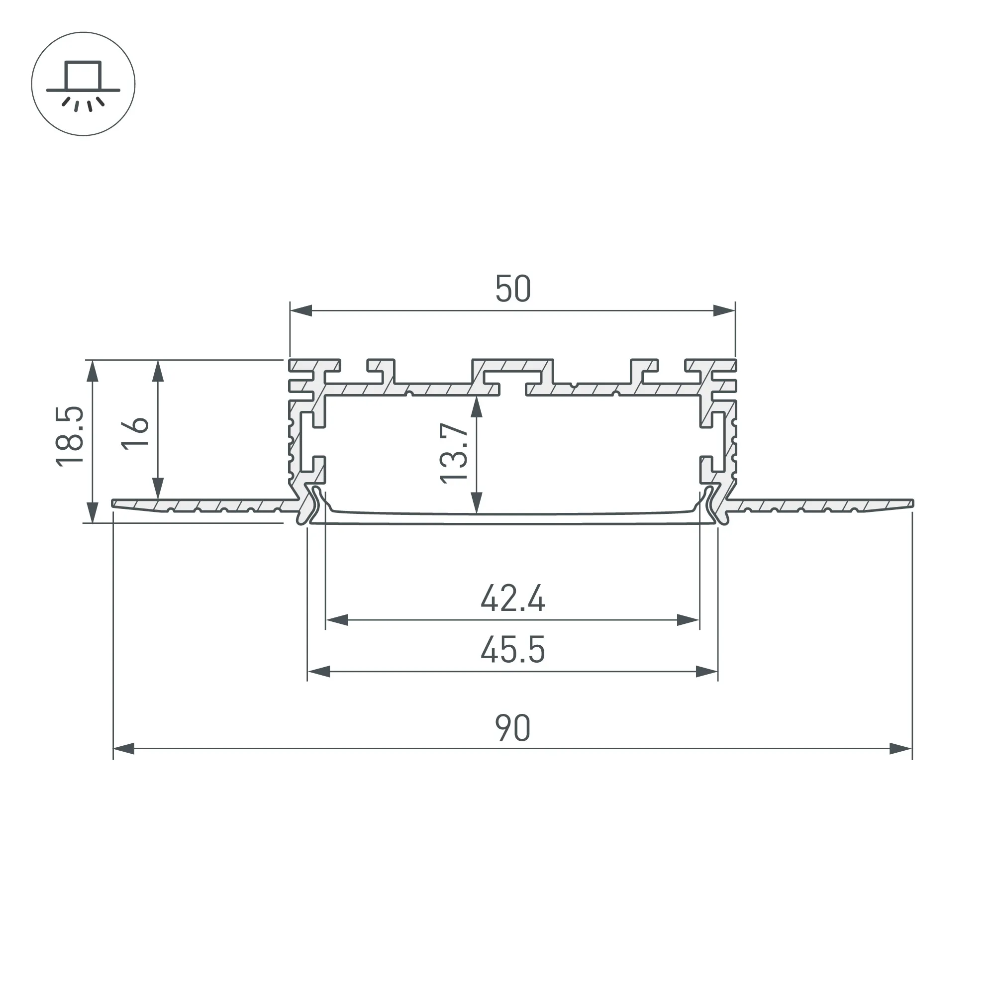Алюминиевый профиль для светодиодных лент и линеек. Встраиваемый в гипсокартон, под строительную отделку. Позволяет создать линию света шириной 45 мм. без видимых частей алюминия. Габаритные размеры (L×W×H): 2000x90x18,5 мм. Ширина площадки для ленты 42,4 мм. Экраны, заглушки и другие аксессуары приобретаются отдельно. Цена за 1 метр.