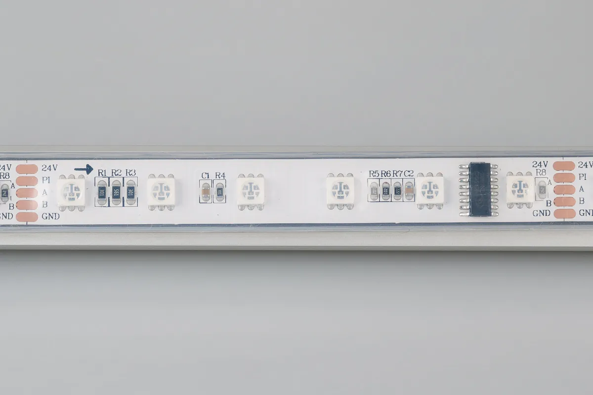 Гибкая лента "Бегущие огни" в силиконовой трубке (IP66) с интерфейсом DMX-512 (драйвер UCS512). Длина 5м, 300 шт LED RGB 5060. 60LED/m (1 pixel = 6 LED), можно резать отрезками по 100 мм. Адреса выставляются редакторами 029067, 019069, 019070, 022992. Питание 24V, 12,5 Вт/м (максимально, в режиме белого). Ширина 14 мм. Герметичные КРУГЛЫЕ коаксиальные коннекторы. Прямое подкл-е к контроллерам DMX-512 (макс. кол-во пикселей - 512 (1536 каналов). Замен-ся на 029760