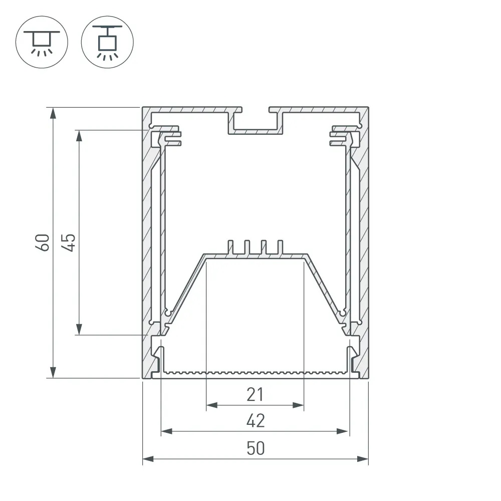 Алюминиевый анодированный профиль для светодиодных лент и линеек. Габаритные размеры (L×W×H): 2000x50x60 мм. Ширина площадки для ленты 21 мм. Отсек для БП 23х33м. Состоит из двух частей - внешней и внутренней. Внутренняя часть (площадка для ленты) легко защёлкивается во внешнюю часть, облегчая процесс монтажа профиля. Экраны, заглушки и другие аксессуары приобретаются отдельно. Цена за 1 метр.