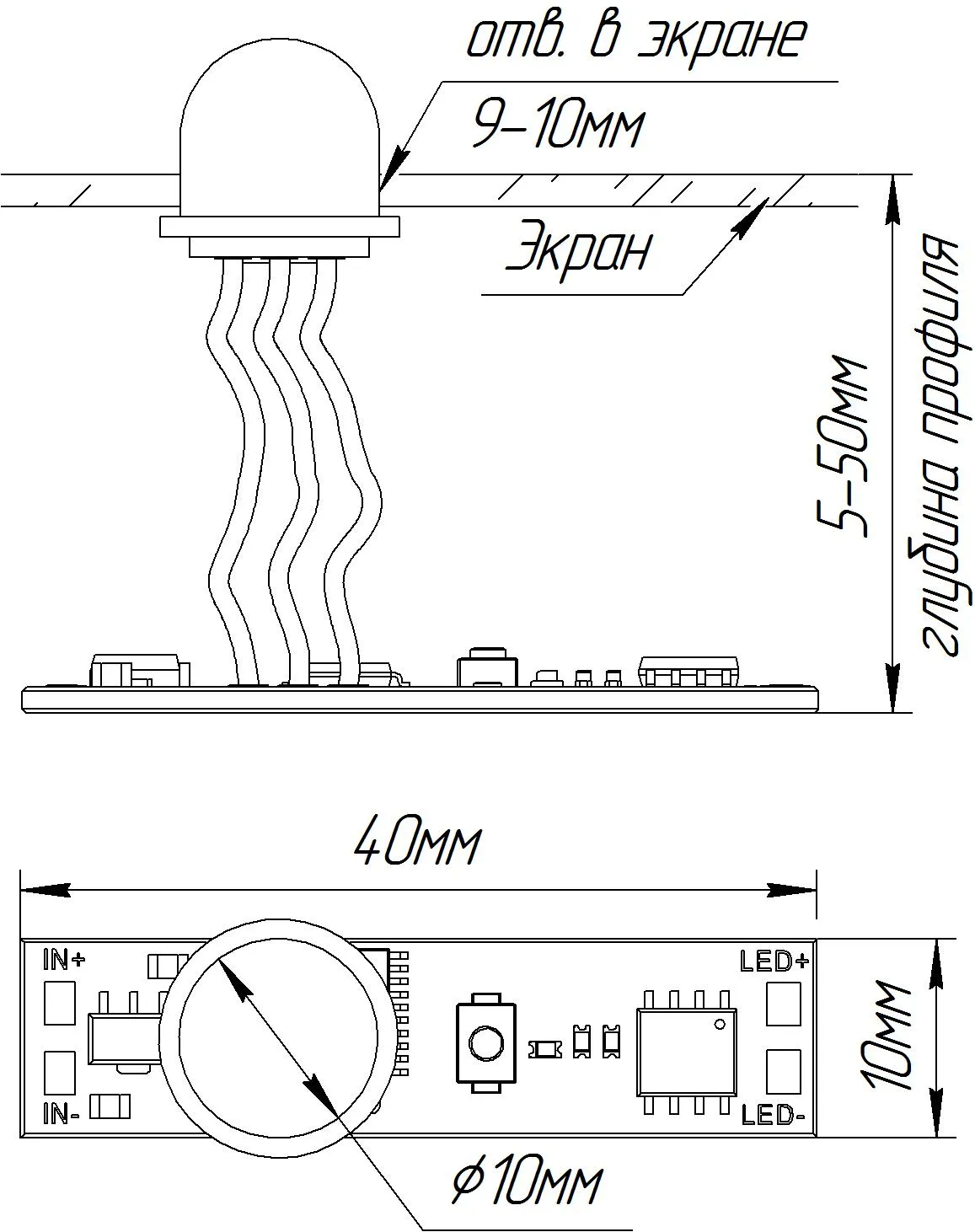 Пассивный ИК-выключатель, встраиваемый в профиль, реагирует на движение. При улавливании движения - плавное включение и выключение света. При пропадании движения - отключение света через ~2мин. Зона срабатывания 1,5-2м. Требуется вырез в экране профиля для работы датчика. Длина кабеля 60мм. Для профилей с внутренней высотой (пов. профиля - пов. экрана) от 5 до 50 мм. 12-24V, 5A. Размер платы 40x11x12 мм, размер датчика: D12х10 мм.