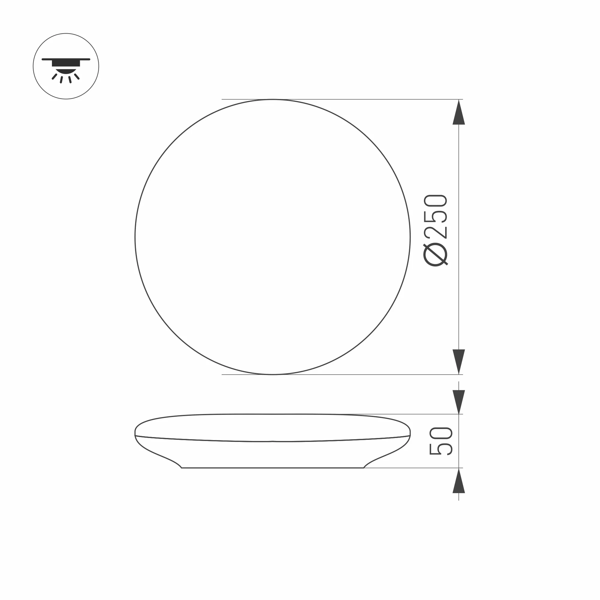 Накладной светильник 12Вт с микроволновым датчиком движения, белый круглый корпус (IK10). Цвет БЕЛЫЙ ДНЕВНОЙ 4000К, св.поток 1150-1200лм, CRI(Ra)>80, угол 180°. Размер Ф250x50мм. Материал рассеивателя PMMA. Материал корпуса ABS пластик. Питание AC220-240V, 12Вт, драйвер встроенный (72V, 160mA).