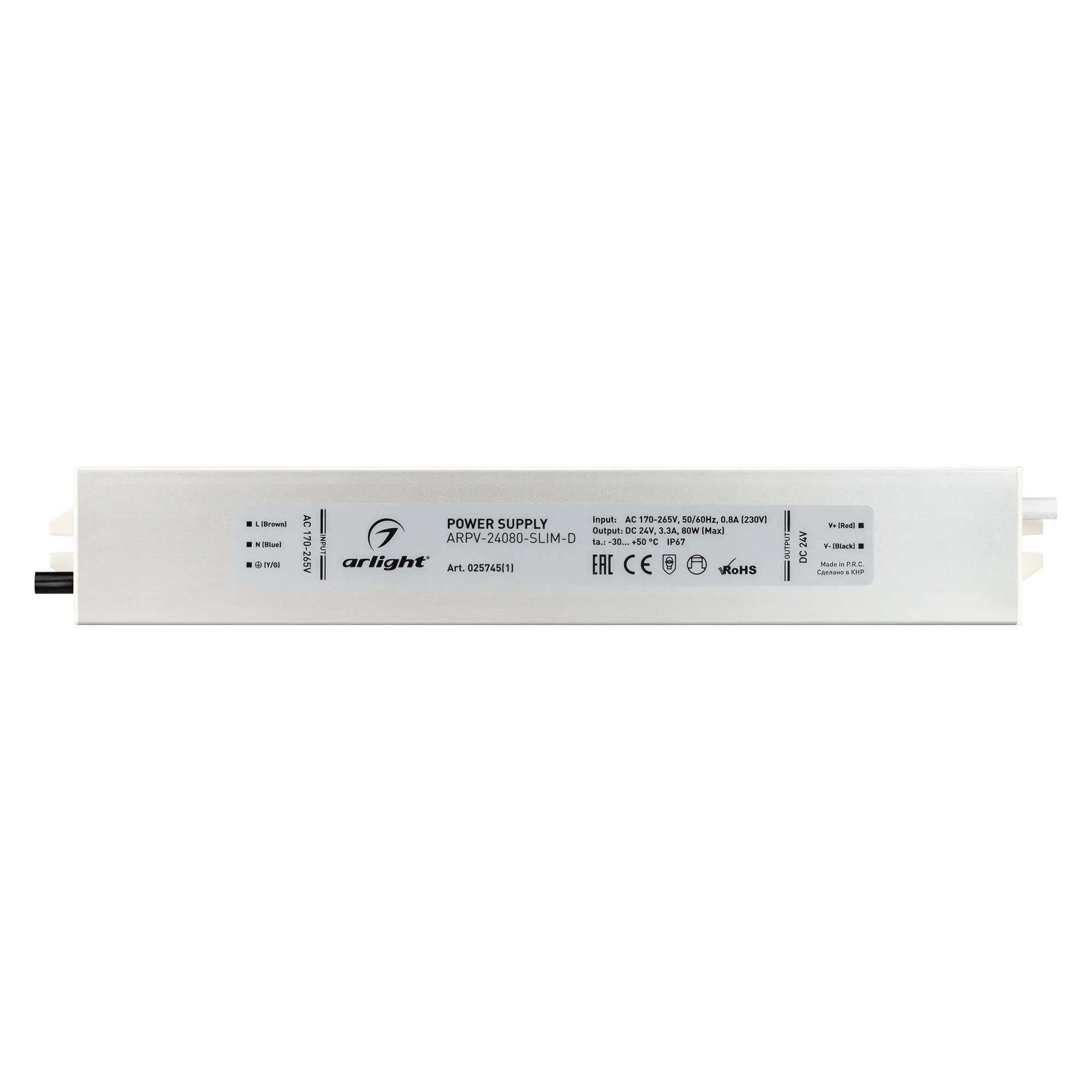 Источник напряжения с гальванической развязкой для светодиодных изделий. Входное напряжение 170-265 VAC. Выходные параметры: 24 В, 3,3 А, 80 Вт. Герметичный алюминиевый корпус IP 67. Рабочая температура -30…+50C⁰. Габаритные размеры длина 258 мм, ширина 40 мм, высота 22 мм. Гарантийный срок 3 года.