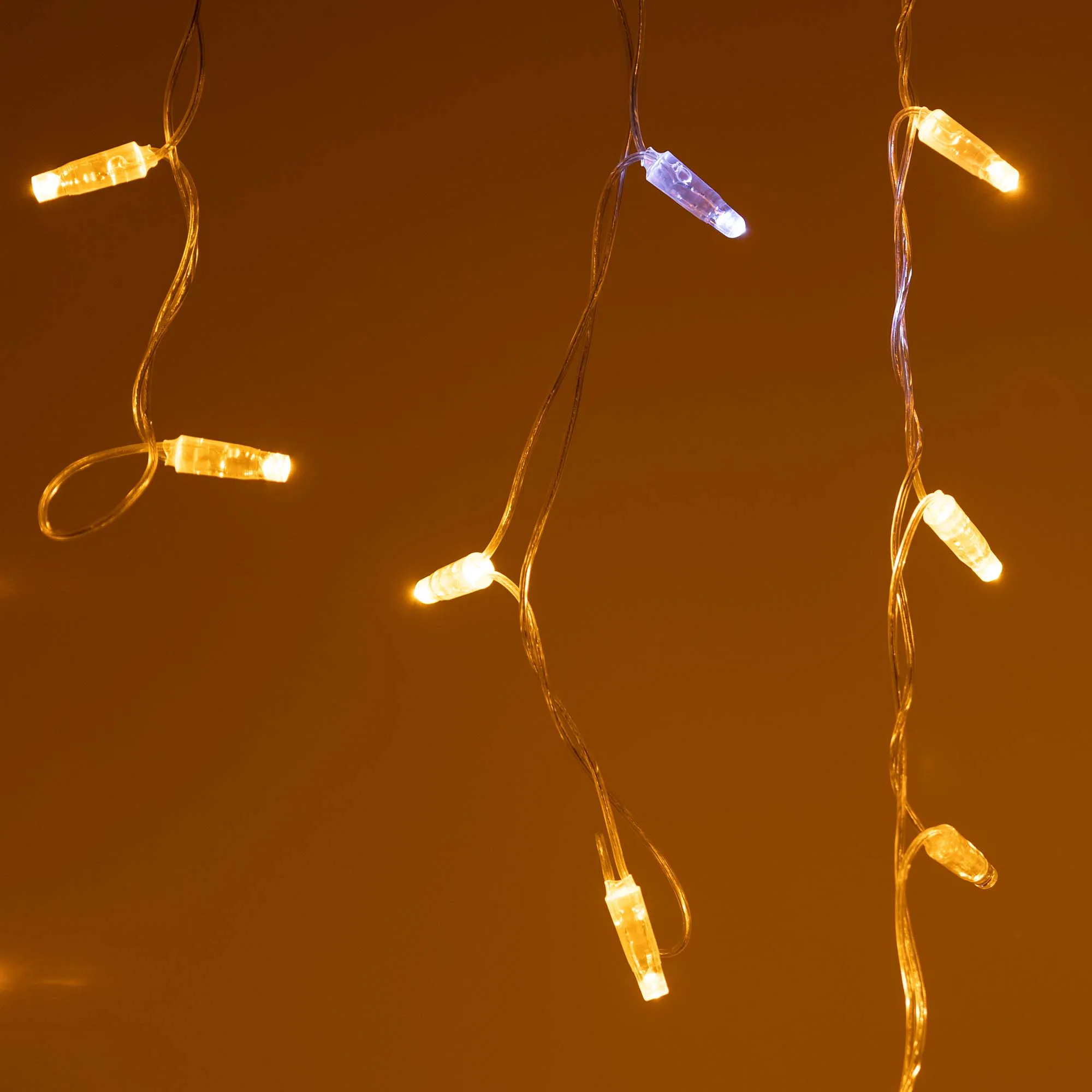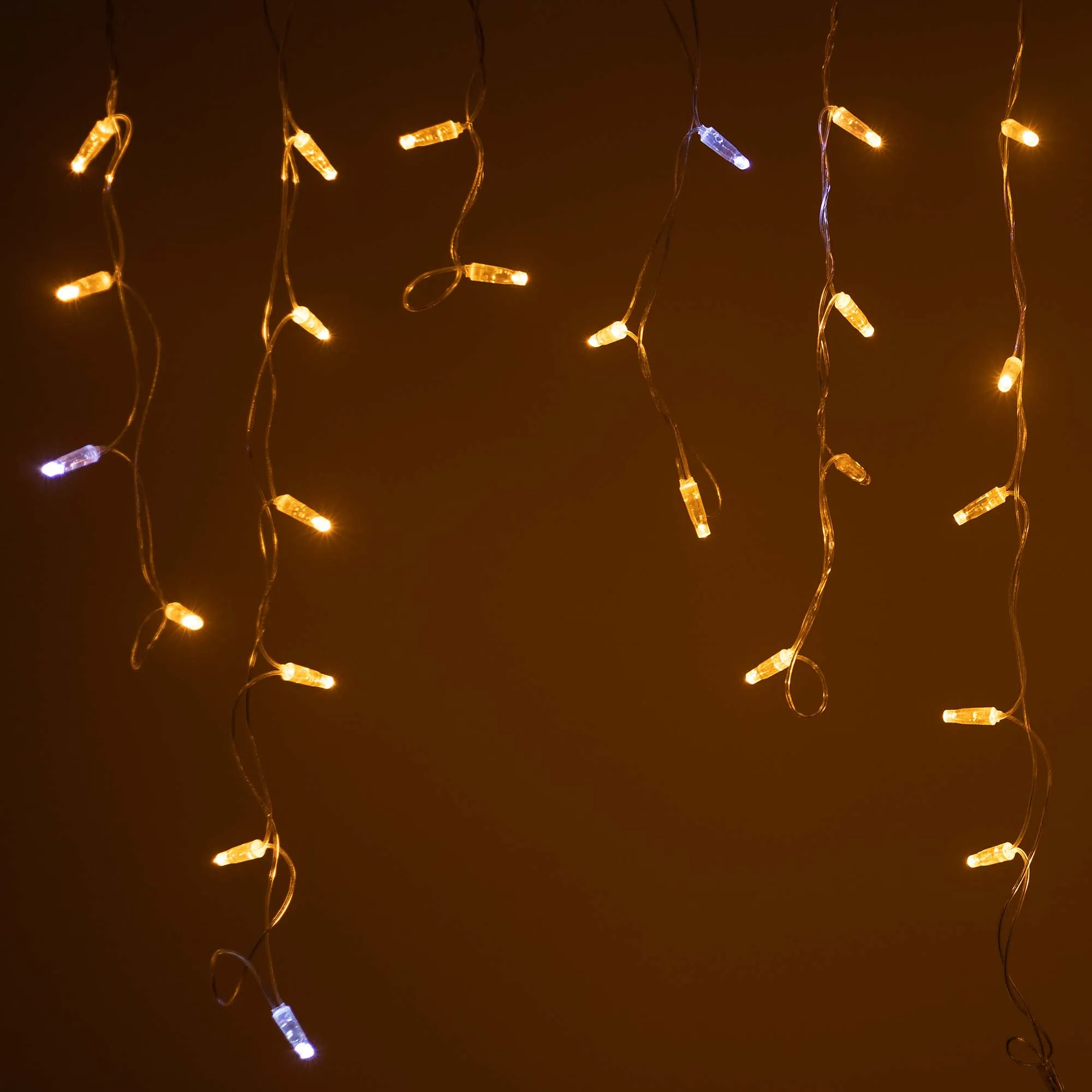 Светодиодная бахрома Classic. Размер 2400 мм (длина 2400 мм, по длине 24 нити высотой 200/600 мм). Количество светодиодов 88 шт размером 7 мм. Основной цвет свечения ЖЕЛТЫЙ, эффект мерцания редких точек (БЕЛЫЙ 6000К) с резким световым рисунком (прозрачная вогнутая линза), соотношение светодиодов: 66 желтых постоянного свечения / 12 белых с мерцанием. Эффект частого мерцания. Провод прозрачный, ПВХ. Питание 230 В, Мощность 6 Вт, защита IP65, применение на улице под навесом. Аксессуары для подключения приобретаются отдельно.