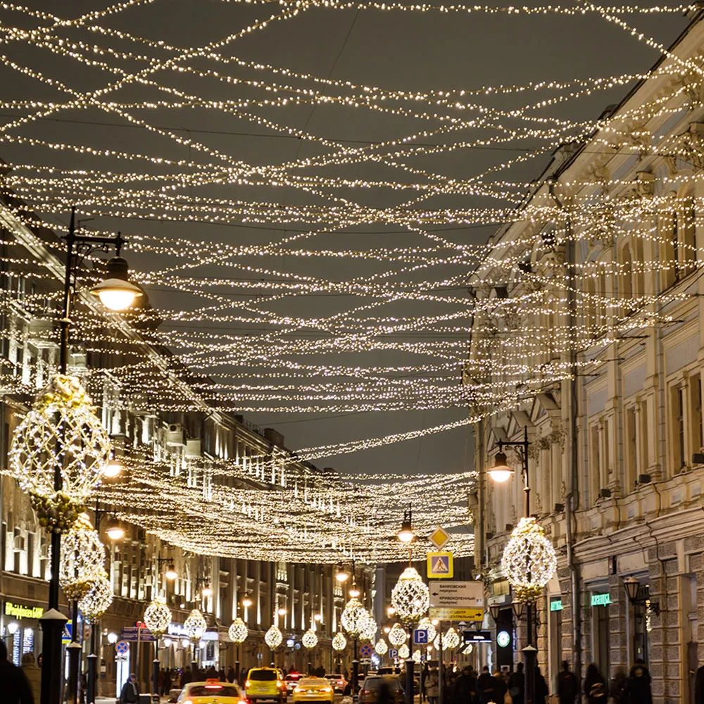 Светодиодная нить Classic. Размер 10000 мм. Цвет свечения ТЕПЛЫЙ БЕЛЫЙ (3000 К). 100 светодиодов размером 7 мм со статическим эффектом свечения с мягким световым рисунком (выпуклая молочно-белая линза). Провод белый, ПВХ. Питание 230 В, Мощность 7 Вт, защита IP65, применение в помещении и на улице под навесом. Аксессуар для подключения приобретается отдельно.