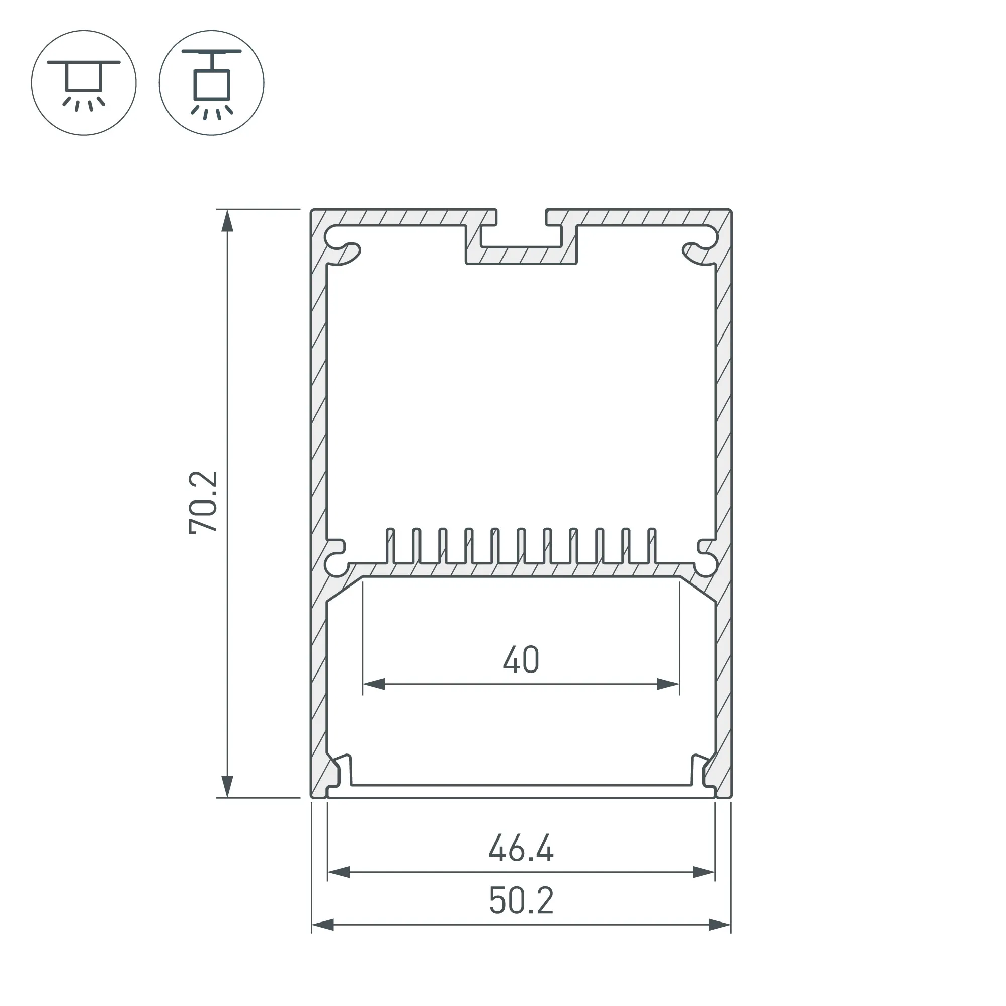 Подвесной/накладной профиль с отсеком для блока питания (до 44х31 мм). Анодированный алюминий. Экран, заглушки и подвес отдельно. Размеры 50х70х2000 мм. Цена за 1м.