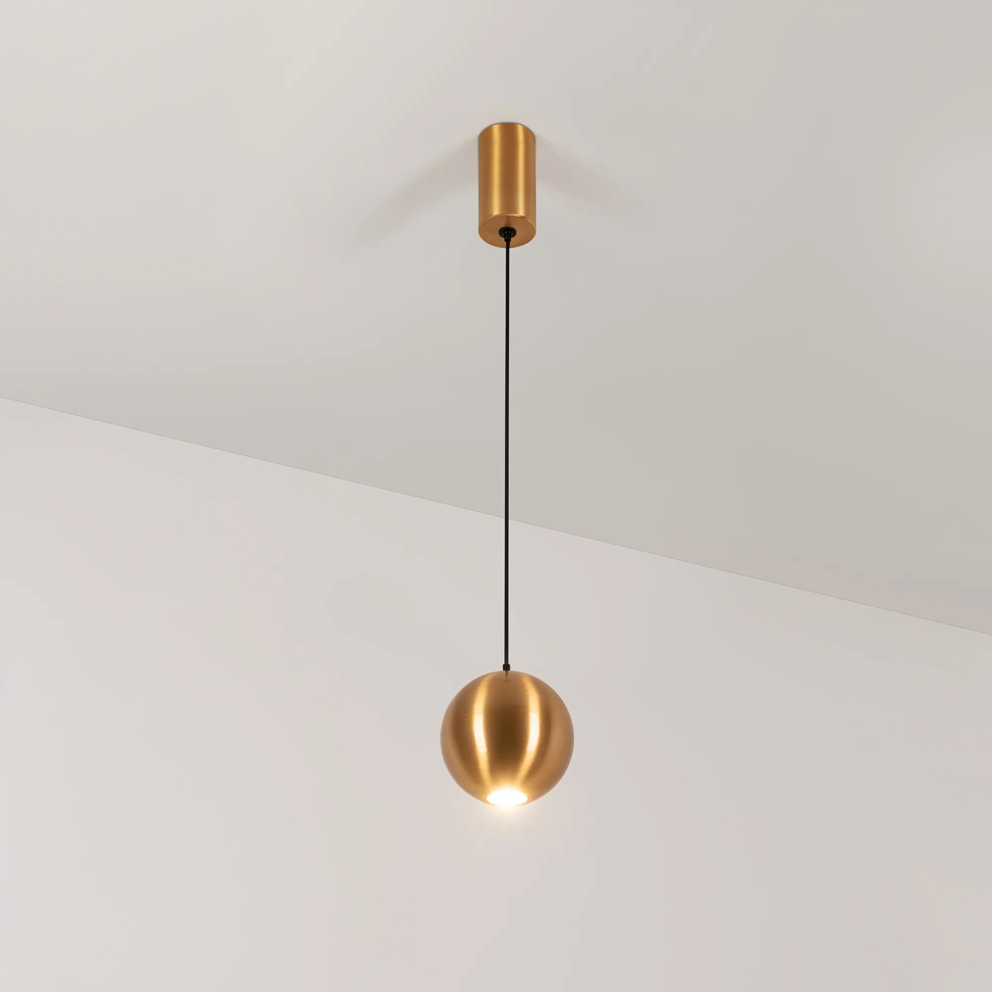 Подвесной светильник. Мощность 9 Вт, св. поток 650 лм, 73 лм/Вт, дневной 4000 K, CRI>80, угол 39°, напряжение питания 230 В. Золотой круглый корпус из алюминия, экран , степень защиты IP40. Размер: диаметр 100 мм, высота 97 мм. Монтаж подвесной, длина подвеса 1500мм, регулируемая. Габариты чаши Ø50x95 мм. Драйвер 28-42 В, 250 мА, пульсация <5%.