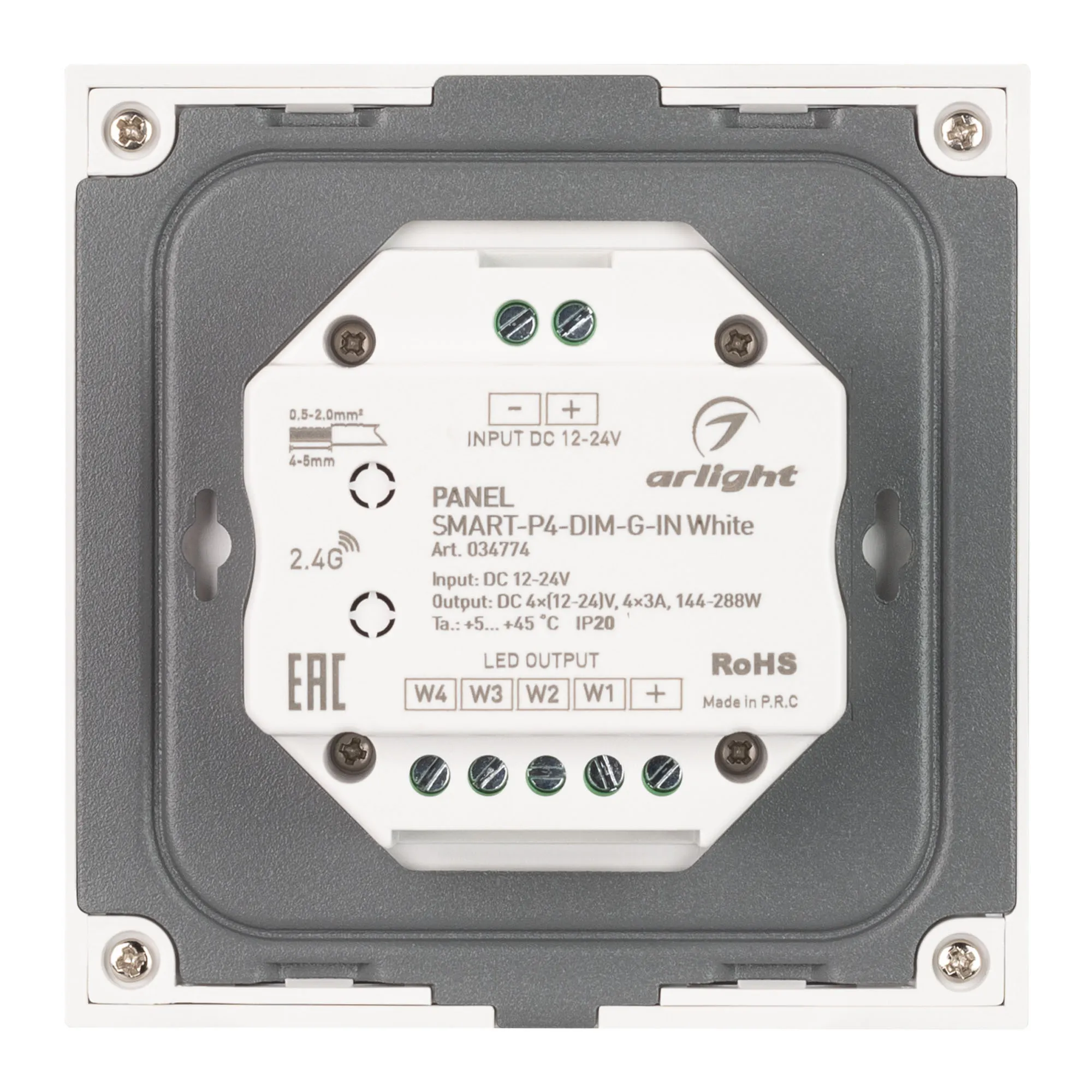В магазине Арлед Маркет Вы можете купить "Панель SMART-P4-DIM-G-IN White (12-24V, 4x3A, Sens, 2.4G) (Arlight, IP20 Пластик, 5 лет)"
