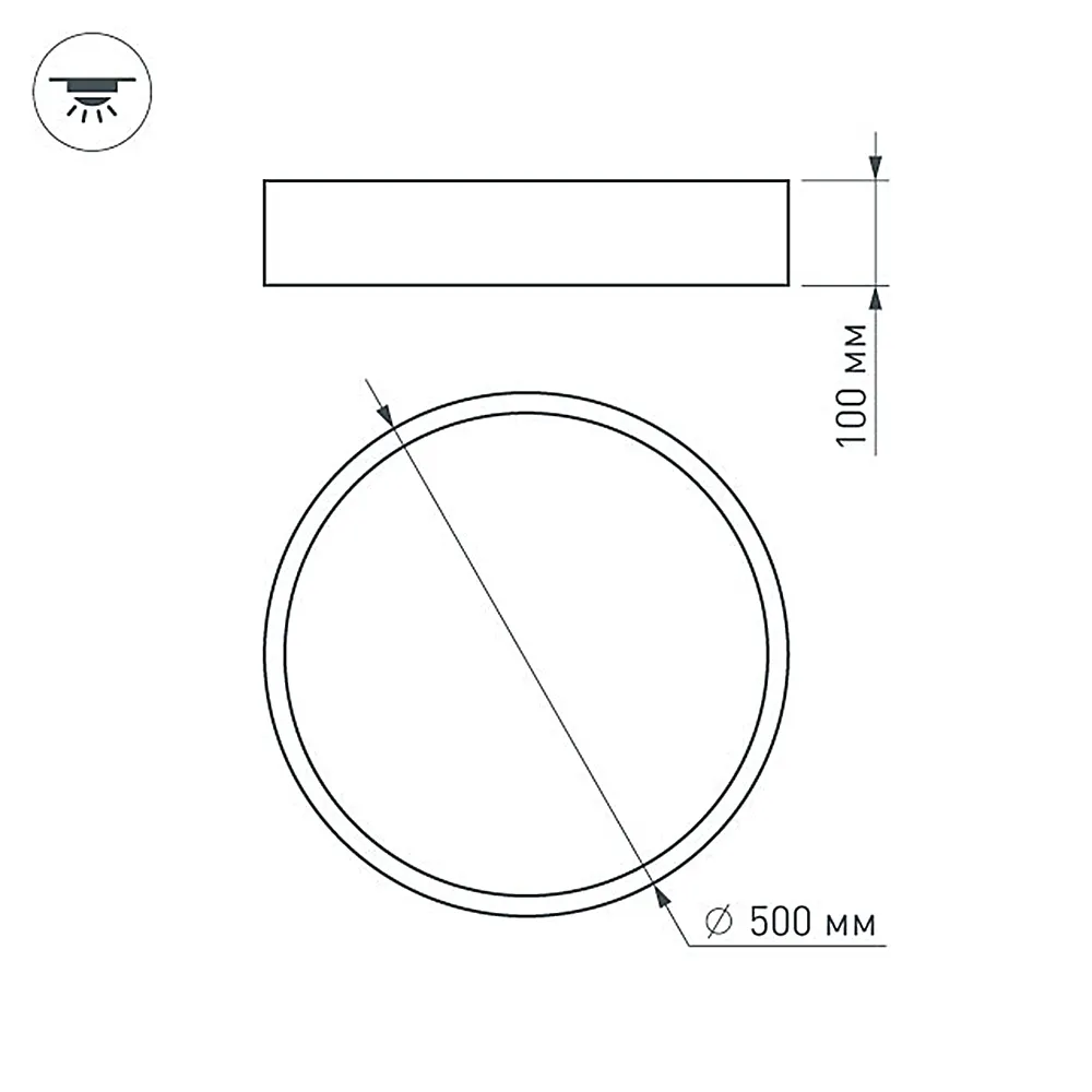 Накладной интерьерный светильник. Мощность 35 Вт, св. поток 3150 лм, 90 лм/Вт, теплый 3000 K, CRI>80, угол 120°, напряжение питания 230 В. Белый круглый корпус из алюминия, степень защиты IP20. Размер: диаметр 500 мм, высота 100 мм. Монтаж накладной. Драйвер 30-42 В, 950 мА, пульсация <5%.