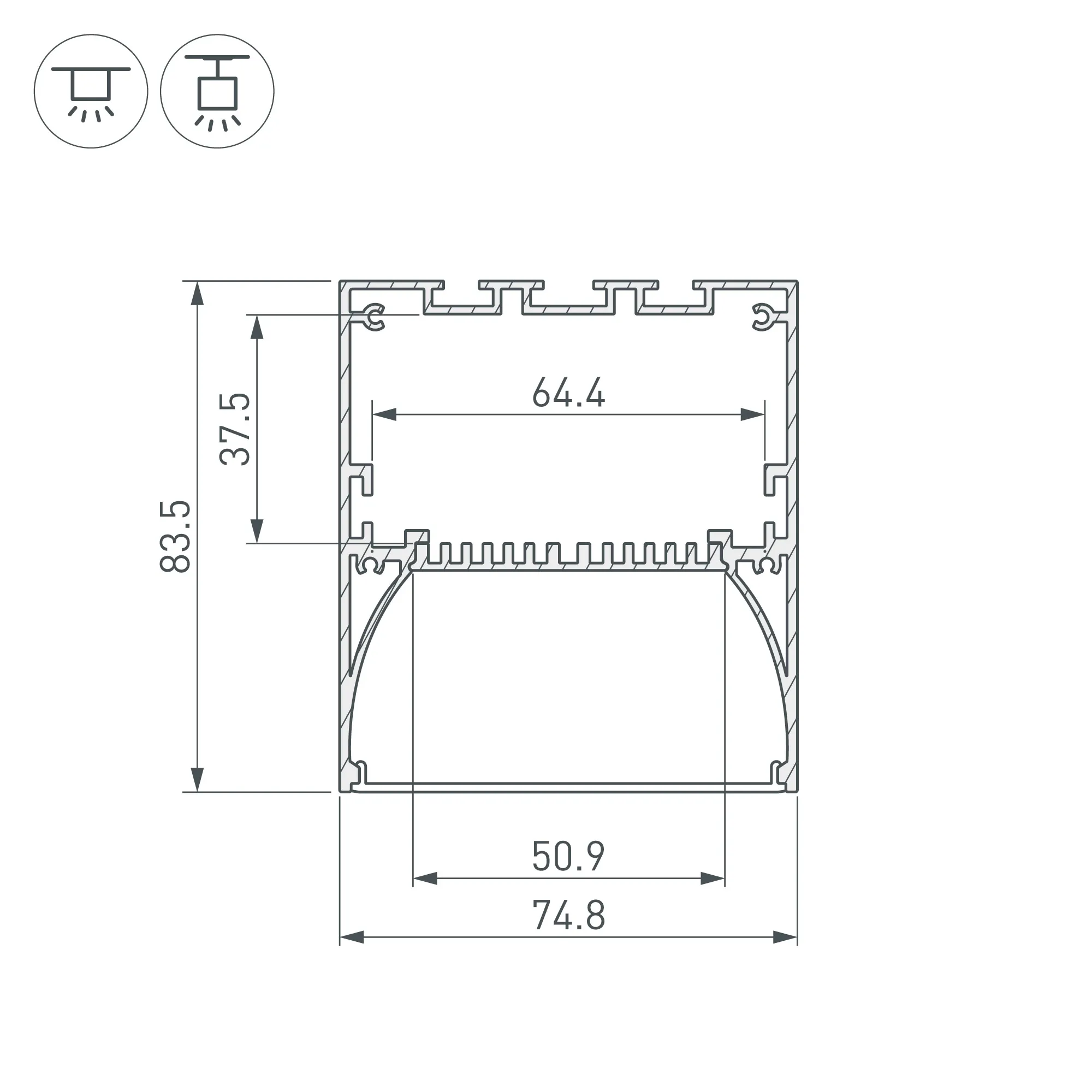 Под заказ от 30 м. Алюминиевый анодированный профиль для светодиодных лент и линеек. Габаритные размеры (L×W×H): 2000x74,8x83.5 мм. Состоит из двух частей - профиля и съемного основания (площадки) для ленты. Ширина площадки для ленты 50.9 мм. Отсек для БП 60х35 мм. Экраны, заглушки и другие аксессуары приобретаются отдельно. Цена за 1 метр.