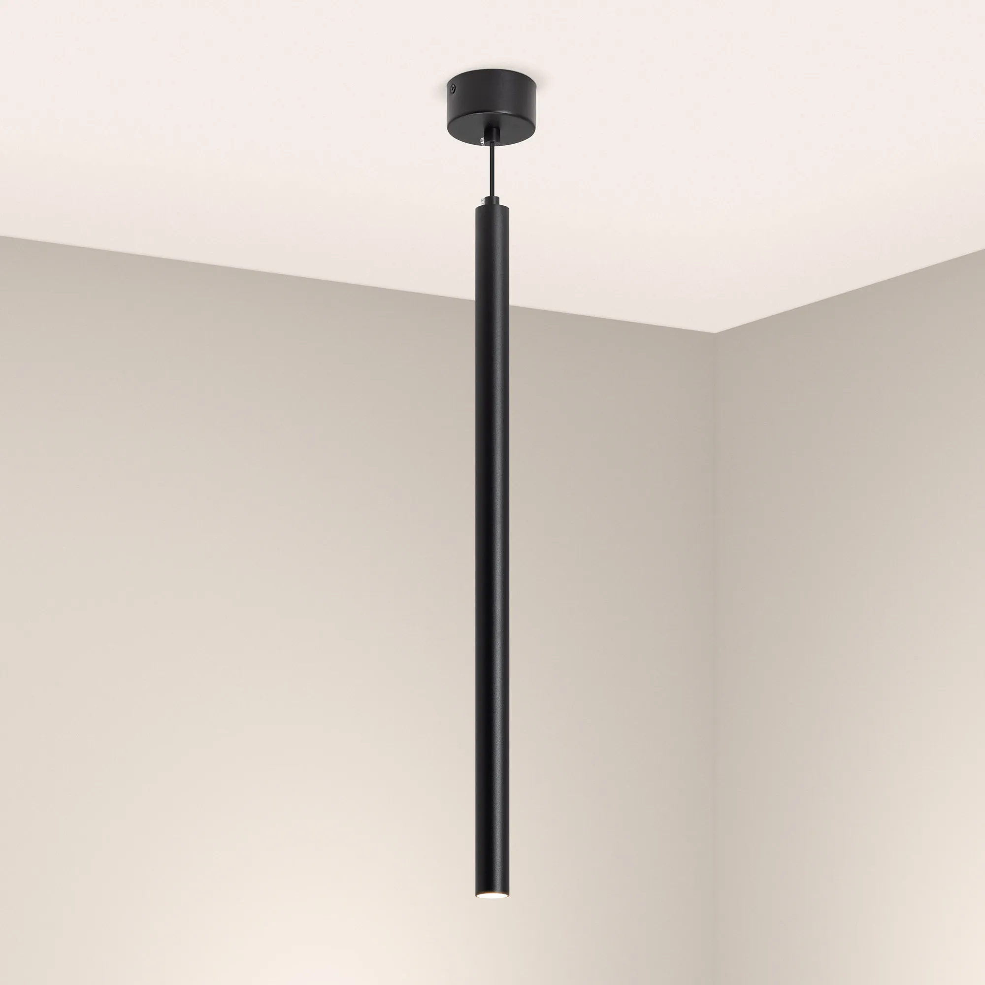 Подвесной светильник. Мощность 9 Вт, св. поток 561 лм, 64 лм/Вт, дневной 4000 K, CRI>90, угол 24°, напряжение питания 230 В. Черный круглый корпус из алюминия, рассеиватель PC, степень защиты IP20. Размер: диаметр 30 мм, длина 600 мм, размер чаши: диаметр 80 мм, высота 40 мм. Монтаж подвесной, длина подвеса 1500 мм. Драйвер 28-42 В, 200 мА, пульсация <1%.