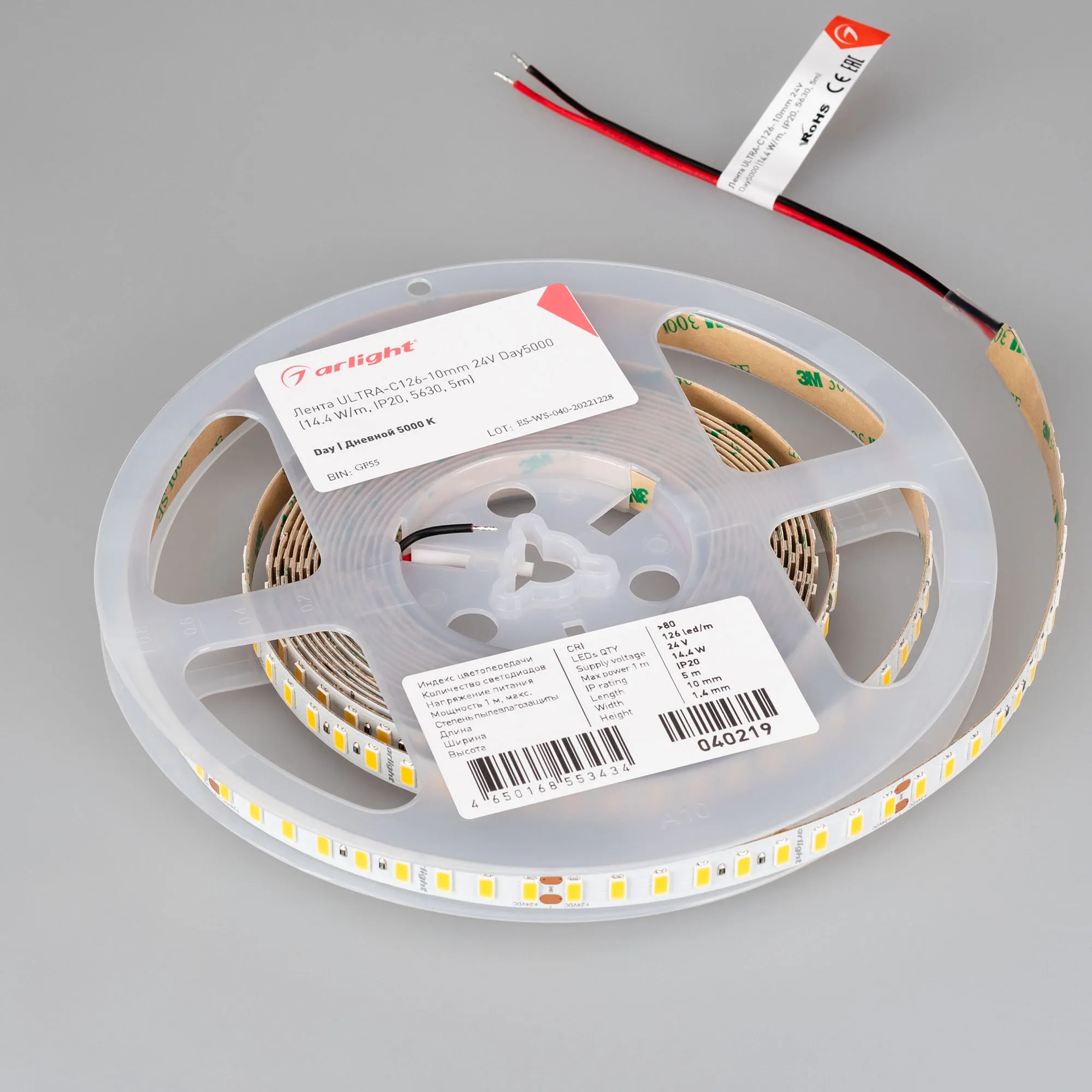 Светодиодная высокоэффективная лента ULTRA серии C126. Светодиоды SMD 5630, 126 шт/м, белая плата шириной 10 мм, скотч 3M. Цвет ДНЕВНОЙ 5000K, высокая световая эффективность 200 лм/Вт, индекс цветопередачи CRI>80, угол 120°. Питание 24 В, мощность 14.4 Вт/м (72 Вт на 5 м). Размеры 5000x10x1.4 мм. Мин. отрезок 71.4 мм, 9 светодиодов. Цена за 1 м. Рекомендуется установка на профиль.