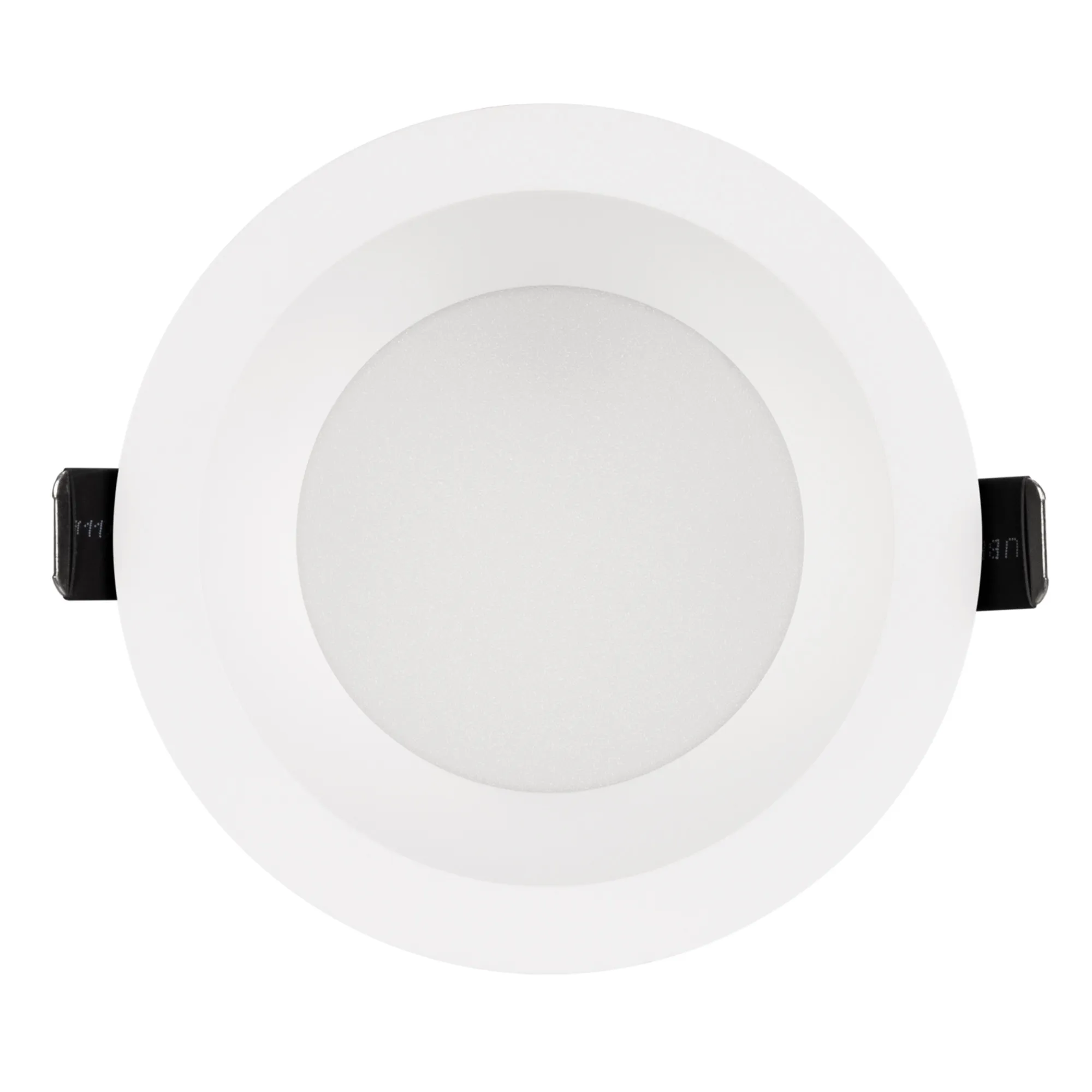 Встраиваемый светильник даунлайт. Мощность 14 Вт, св. поток 1235 лм, 88 лм/Вт, дневной 4000 K, CRI>90, угол 85°, напряжение питания 230 В. Белый круглый корпус из алюминия, степень защиты IP54. Размер: диаметр 105 мм, высота 58 мм. Монтаж встраиваемый, установочное отверстие: диаметр 95 мм. Драйвер IP54, 26-42 В, 350 мА, пульсация <2%.