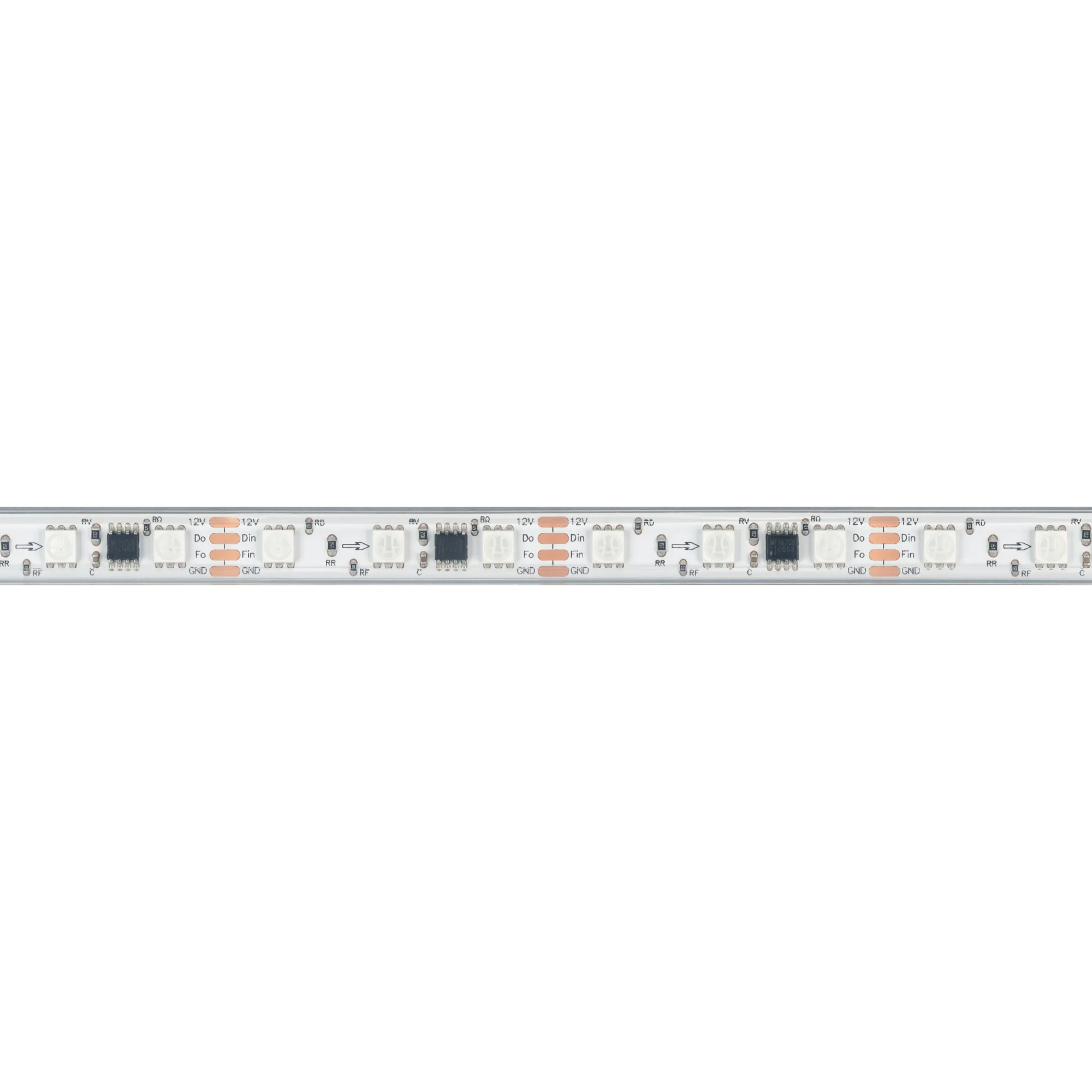 Светодиодная герметичная лента SPI серии B60 с микросхемой MT1808A, IP67 (PS - силиконовая экструзия). Светодиоды SMD 5060, 60 шт/м, 20 pixels на 1м (100 pixels на 5 м), 1 pixel = 3 светодиода, белая плата шириной 10 мм, скотч 3М. Цвет RGB, угол 120°. Питание 12 В, мощность 12 Вт/м (60 Вт на 5 м). Размеры 5000x12x5 мм. Мин. отрезок 50 мм, 3 светодиода. Цена за 1 м.