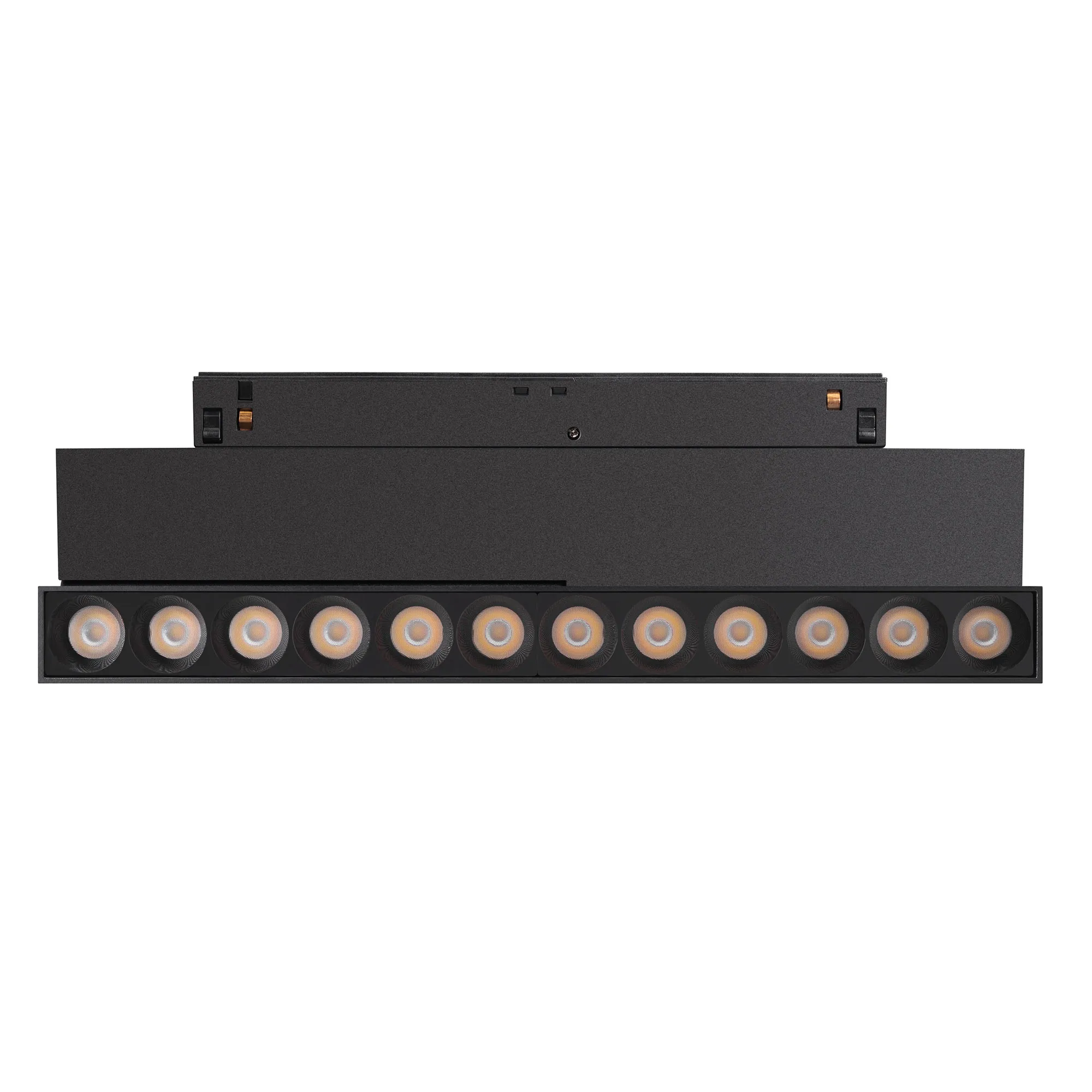 Светильник для магнитных треков MAG-ORIENT шириной 26 мм с управлением DALI(DT8) и изменяемой цветовой температурой. Мощность 12 Вт, св. поток 770-950 лм, 64-79 лм/Вт, изменяемая цветовая температура 2700-6500 K, CRI>90, угол 30°, напряжение питания 48 В. Черный прямоугольный корпус из металл, экран поликарбонат, степень защиты IP20. Размер: длина 232 мм, ширина 23 мм, высота 99 мм. Монтаж на трек MAG-ORIENT. Пульсация <1%.