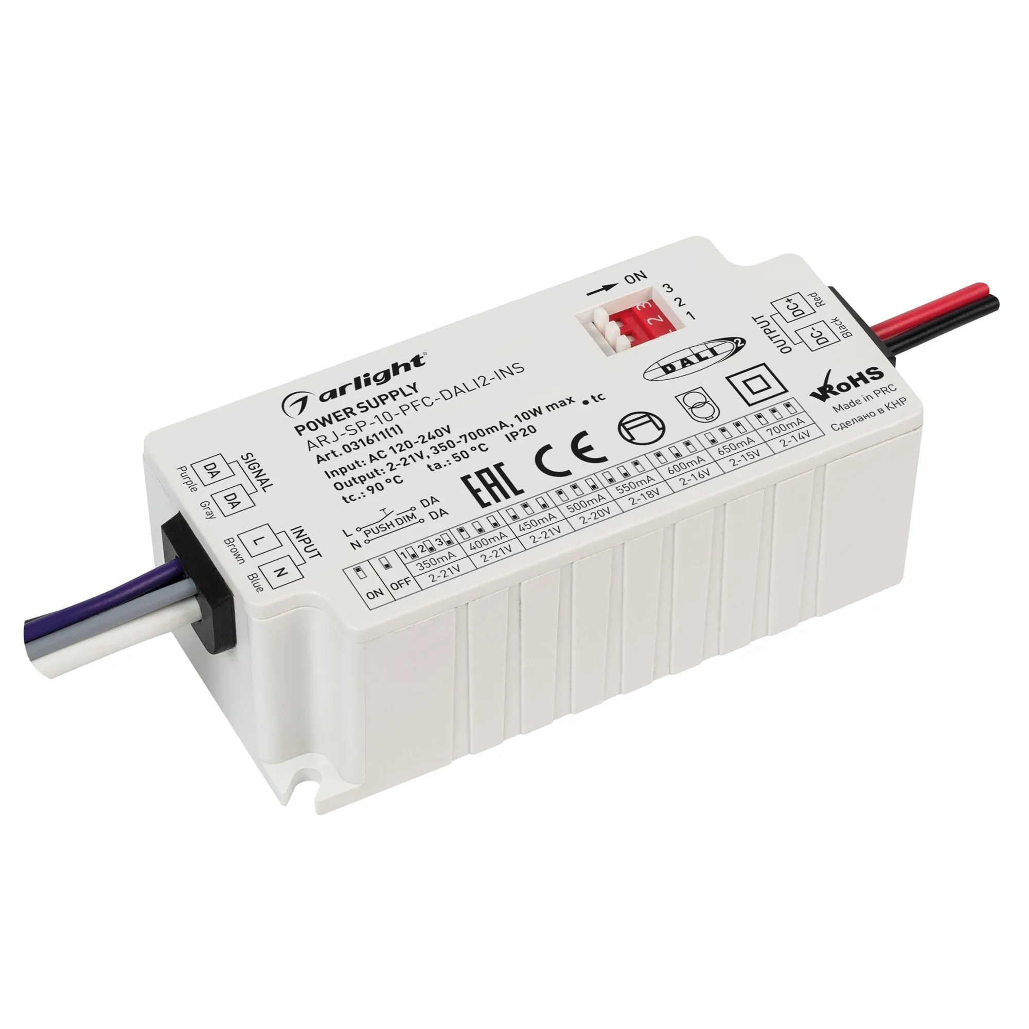 Поставка под заказ от 500 шт. Диммируемый источник тока по протоколу DALI 2.0 с гальванической развязкой для светильников и мощных светодиодов. Входное напряжение 120-240 VAC. Выходные параметры: 2-21 V - 350/400/450 mА, 2-20V - 500mA, 2-18V - 550mA, 2-16V - 600mA, 2-15V - 650mA, 2-14V - 700mA (дип-переключатель на корпусе), макс. мощность 10W. Встроенный PFC >0,95. Негерметичный пластиковый корпус IP 20. Габаритные размеры длина 75 мм, ширина 35 мм, высота 27 мм. Гарантийный срок 5 лет.