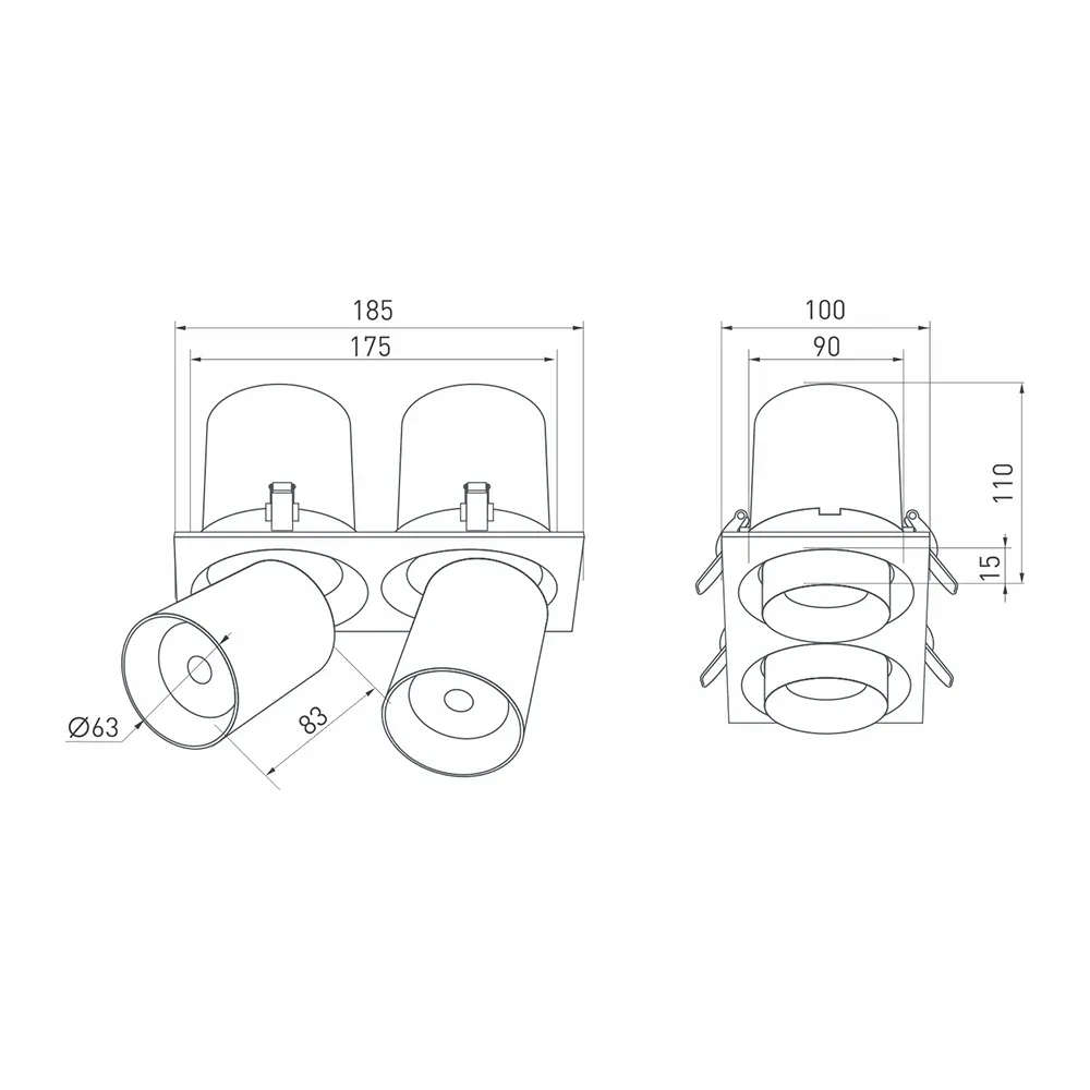 Встраиваемый поворотный выдвигающийся светильник для потолка. Светодиоды 2x10W, цвет БЕЛЫЙ 6000K, св.поток 1900лм, угол 20°, RA>90. Корпус белый. Мощность 20Вт, питание AC220-240V. Размеры WxLxH 100x185x110мм. Установка в отверстие 90x175мм. Драйвера в комплекте (2 шт 27-38V 260mA).