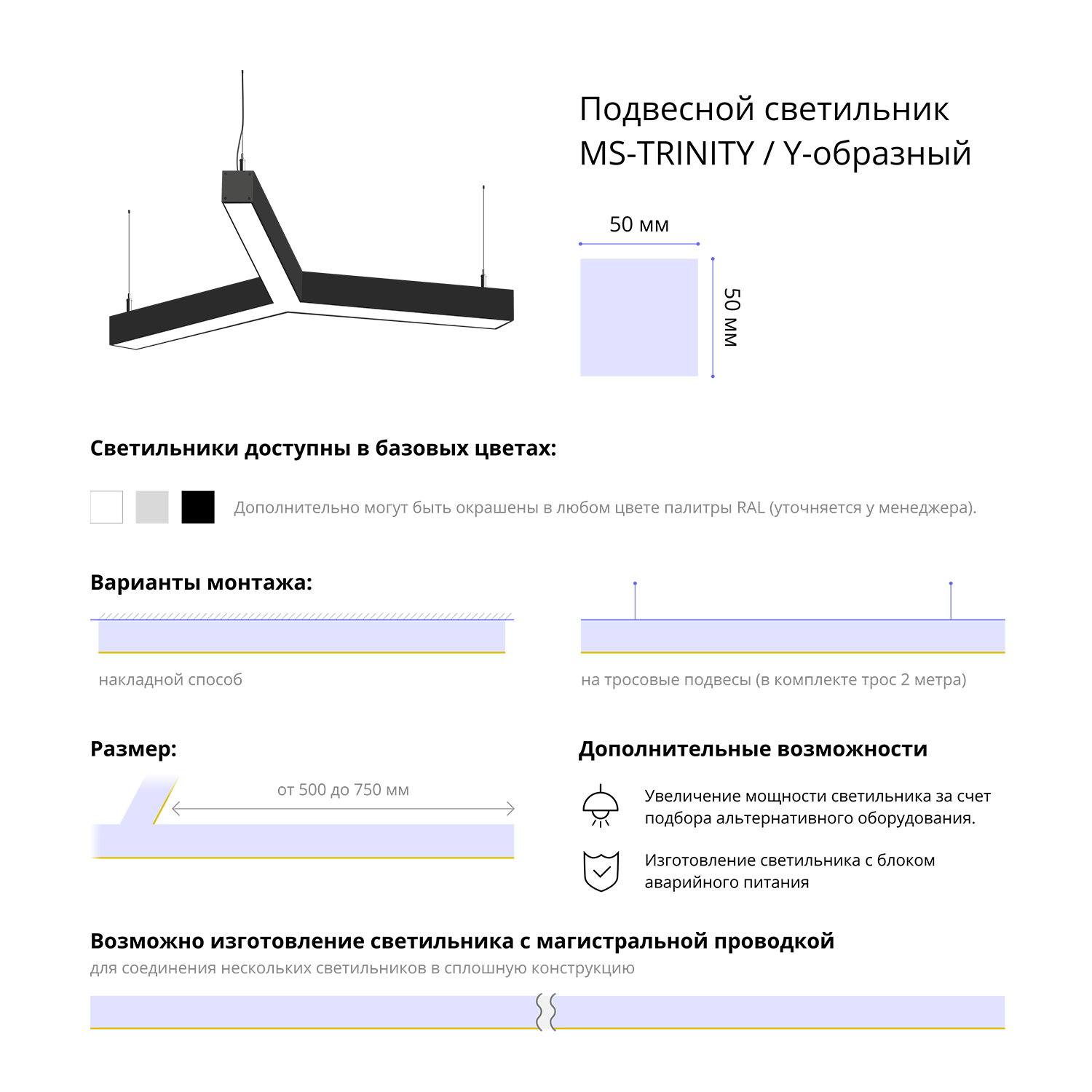- Варианты монтажа: на тросовые подвесы (в комплекте трос 2 метра) и накладным способом.
