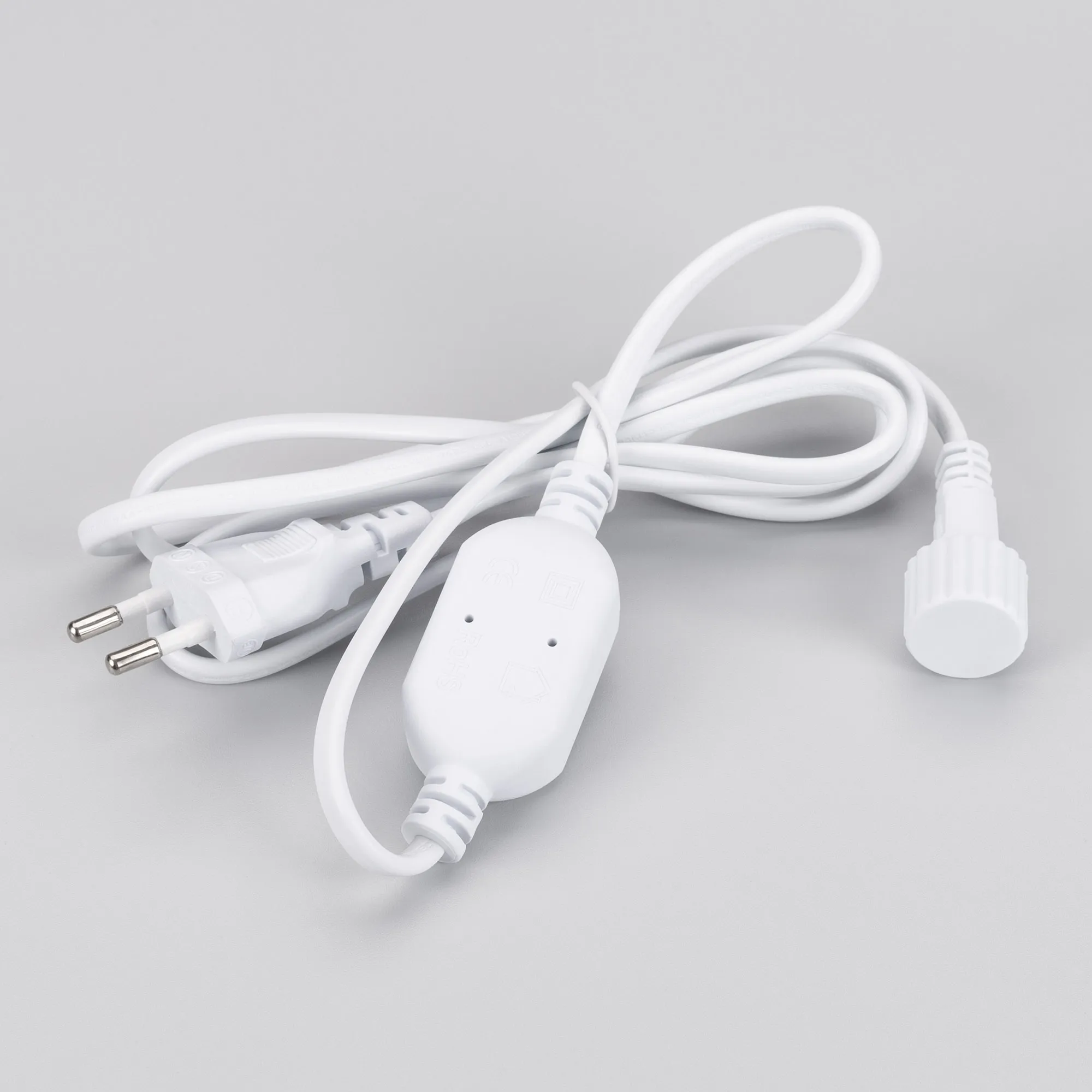 Шнур питания для светодиодных гирлянд с эффектом мерцания. Материал оболочки ПВХ. Цвет провода белый. В комплект входит: шнур питания с вилкой европейского стандарта (IP44), 2pin разъём подключения к гирлянде, выпрямитель AC/DC (1.6A). Длина провода 1.5 метра.