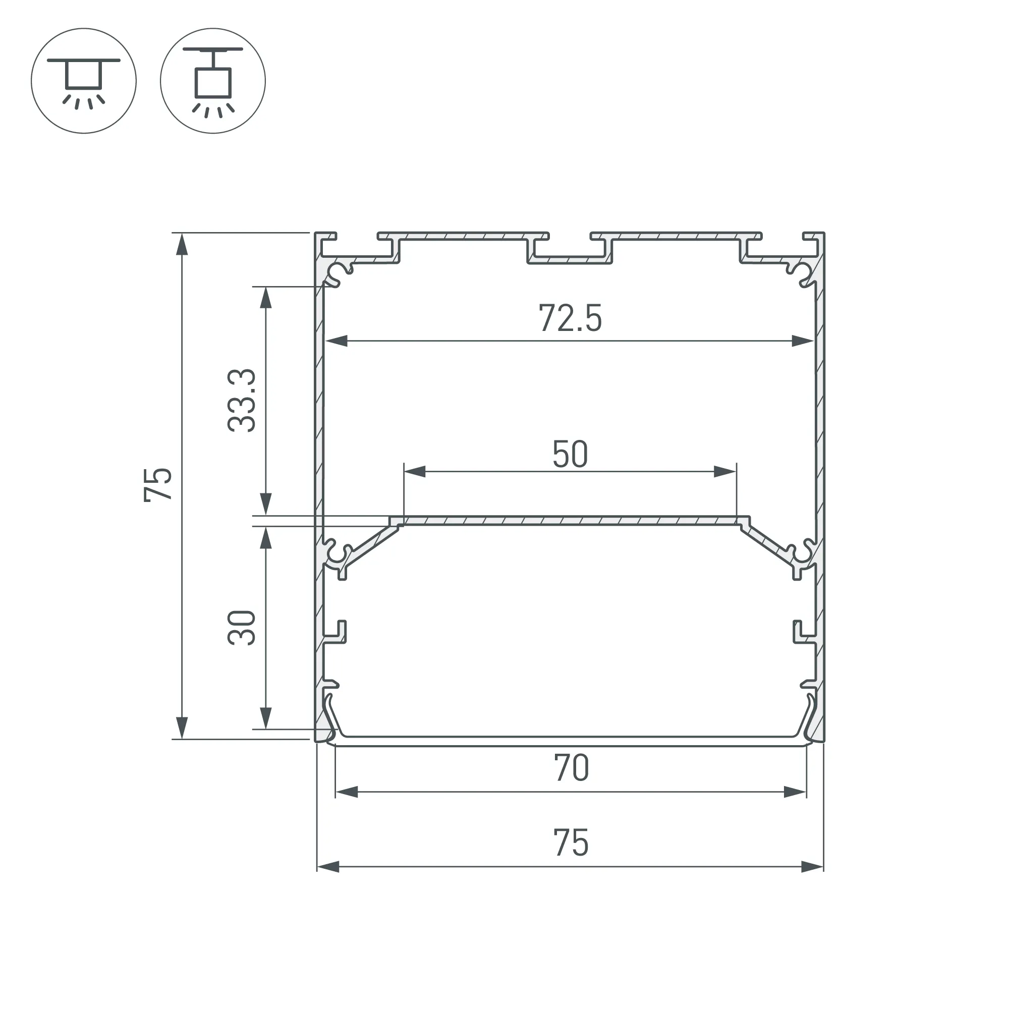 Алюминиевый анодированный профиль для светодиодных лент и линеек. Габаритные размеры (L×W×H): 2500x75x75 мм. Ширина площадки для ленты 50 мм. Отсек для БП 72,5х33,3 мм. Экраны, заглушки и другие аксессуары приобретаются отдельно. Цена за 1 метр.
