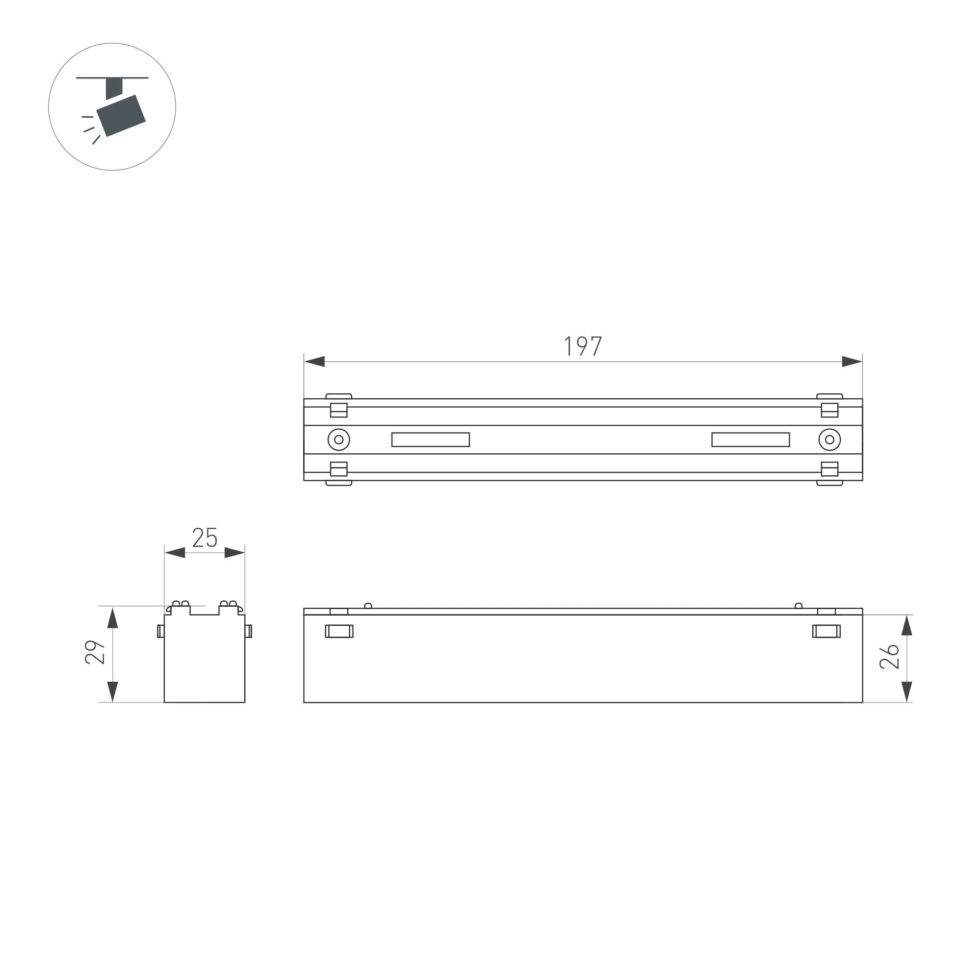 Светильник для магнитных треков MAG-VIBE. Мощность 12 Вт, св. поток 910 лм, 76 лм/Вт, дневной 4000 K, CRI>90, угол 24°, напряжение питания 48 В. Черный прямоугольный корпус из алюминия, экран поликарбонат, степень защиты IP20. Размер: длина 197 мм, ширина 25 мм, высота 29 мм. Монтаж на трек MAG-VIBE. Пульсация <1%.