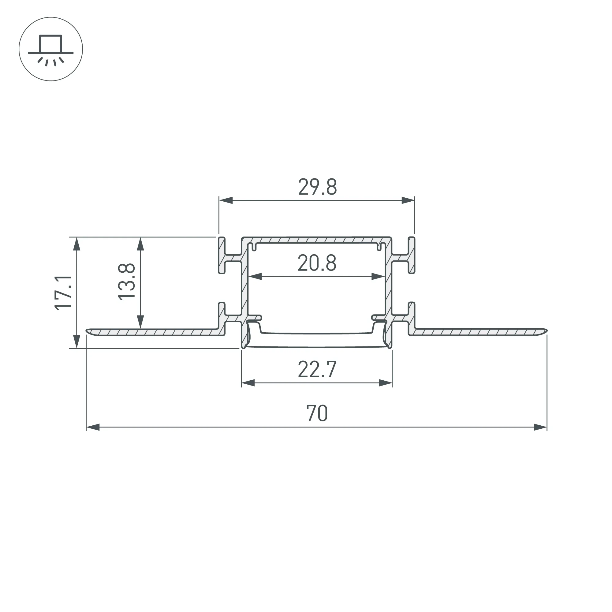 Алюминиевый встраиваемый гибкий профиль для светодиодных лент и линеек. Изгиб вправо/влево. Минимальный радиус изгиба 50 см. Габаритные размеры (L×W×H): 2000х70х17,1 мм. Ширина площадки для ленты 17 мм. Экраны, заглушки и другие аксессуары приобретаются отдельно. Цена за 1 метр.