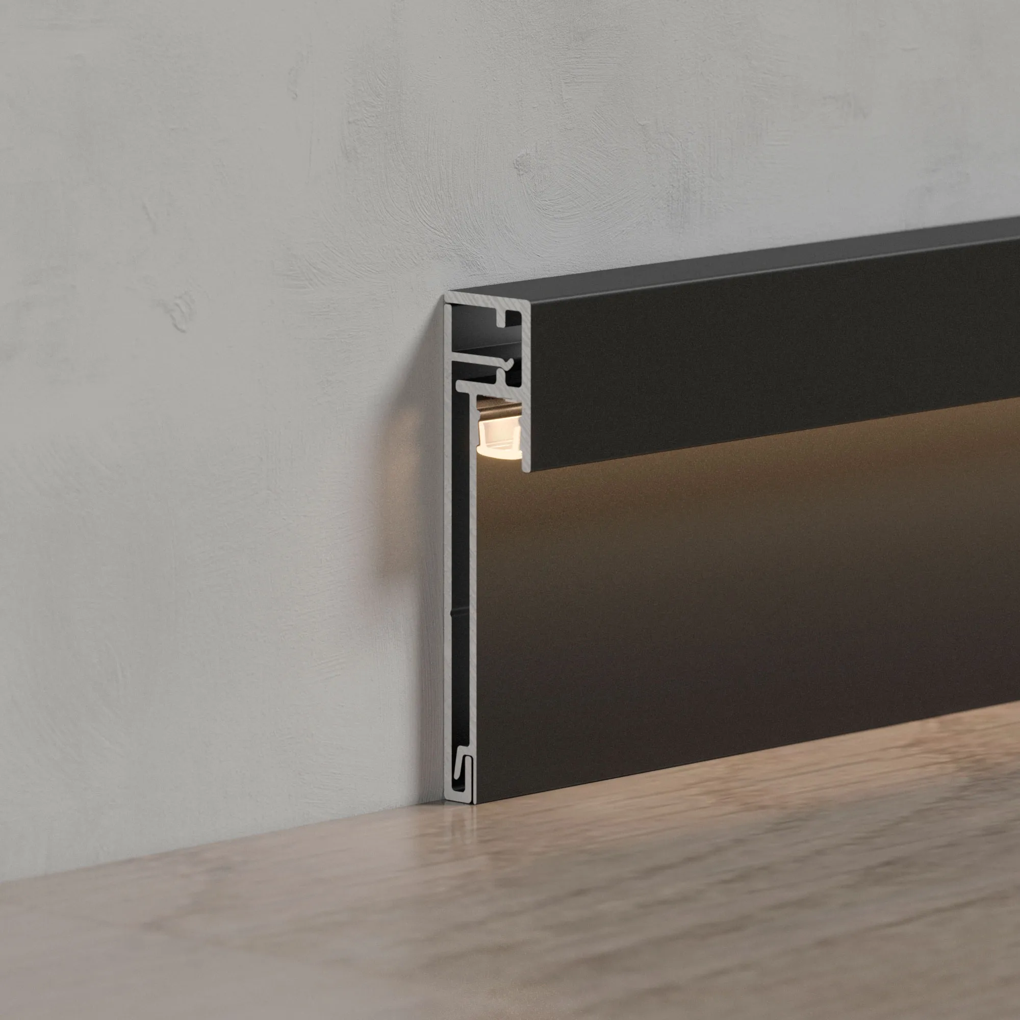 Алюминиевый накладной двухкомпонентный профиль-плинтус для светодиодных лент и линеек. Цвет - черный RAL9005 (порошковая окраска). Габаритные размеры (L×W×H): 2000x12,3x52,6мм. Ширина площадки для ленты 5 мм. Аксессуары приобретаются отдельно. Цена за метр.