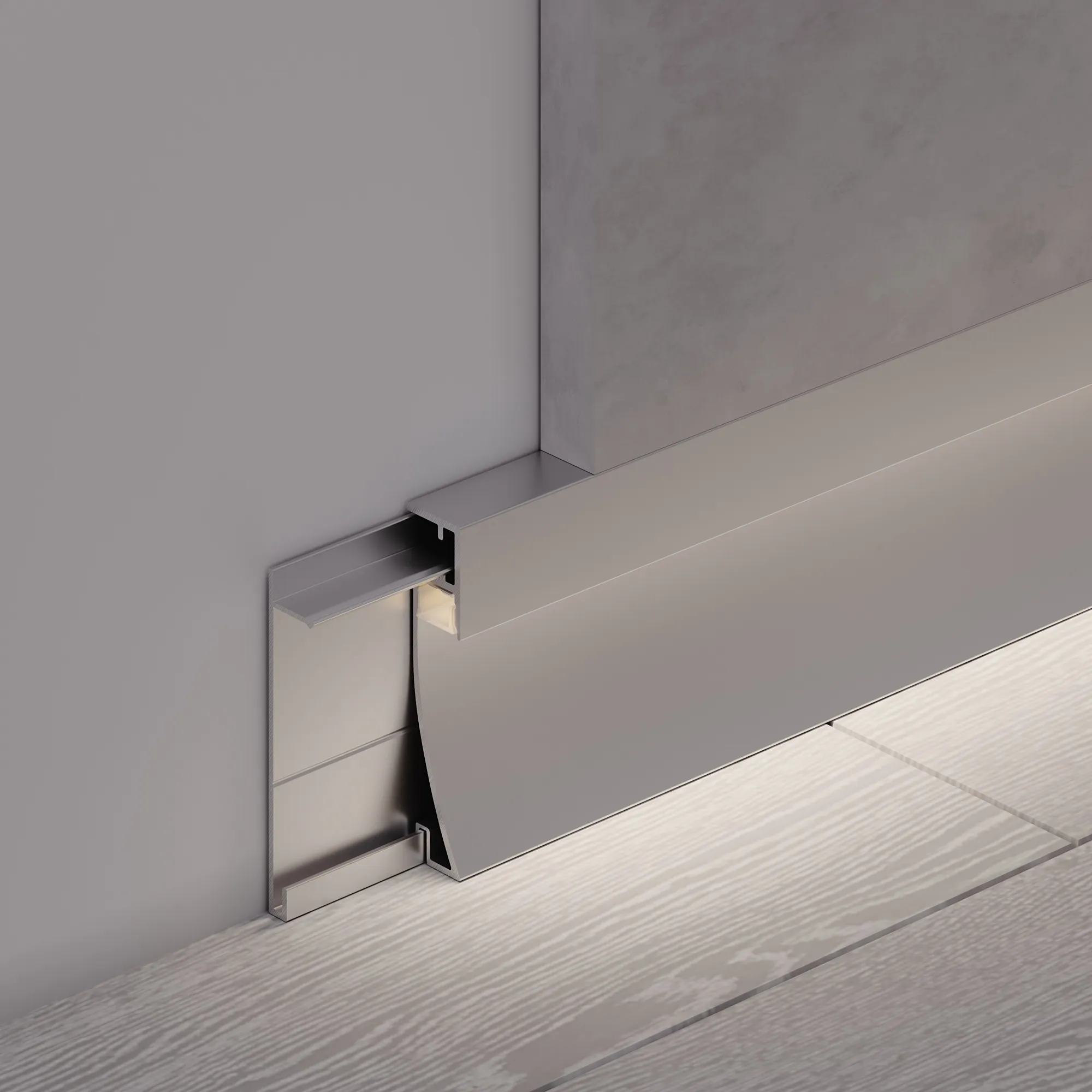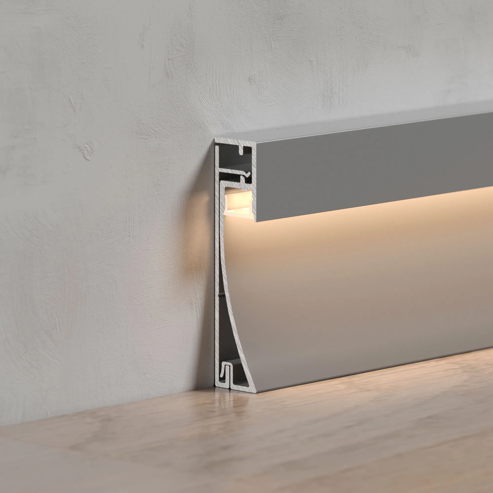 Алюминиевый анодированный накладной двухкомпонентный профиль-плинтус для светодиодных лент и линеек. Габаритные размеры (L×W×H): 2000x12,2x53,3мм. Ширина площадки для ленты 8 мм. Аксессуары приобретаются отдельно. Цена за метр.