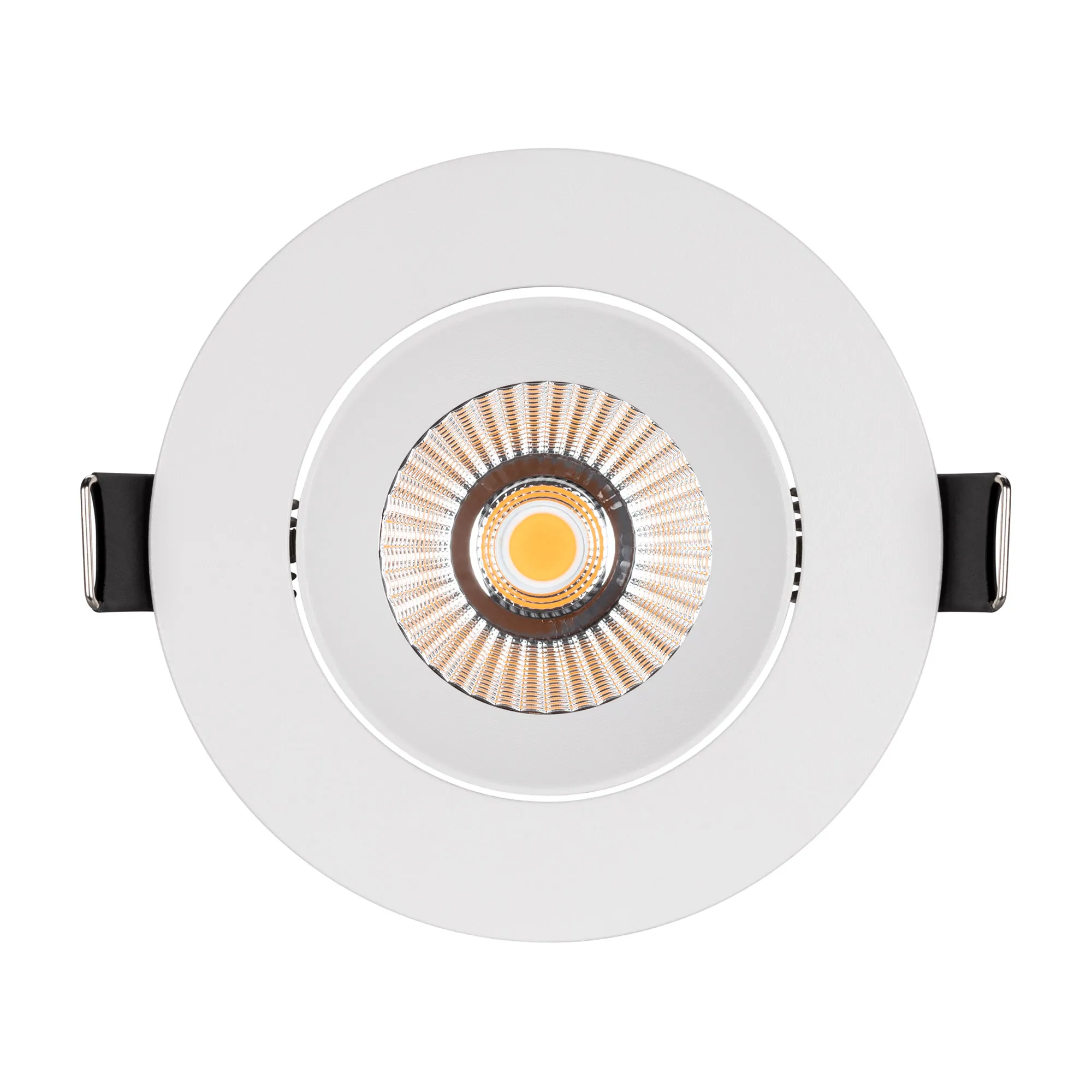 Встраиваемый поворотный светильник даунлайт. Мощность 10 Вт, св. поток 750 лм, 75 лм/Вт, теплый 3000 K, CRI>90, угол 36°, напряжение питания 230 В. Белый круглый корпус из алюминия, экран PMMA, степень защиты IP54. Размер: диаметр 94 мм, высота 75 мм. Монтаж встраиваемый, установочное отверстие: диаметр 77 мм. Драйвер IP54, 20-40 В, 250 мА, пульсация <1%.